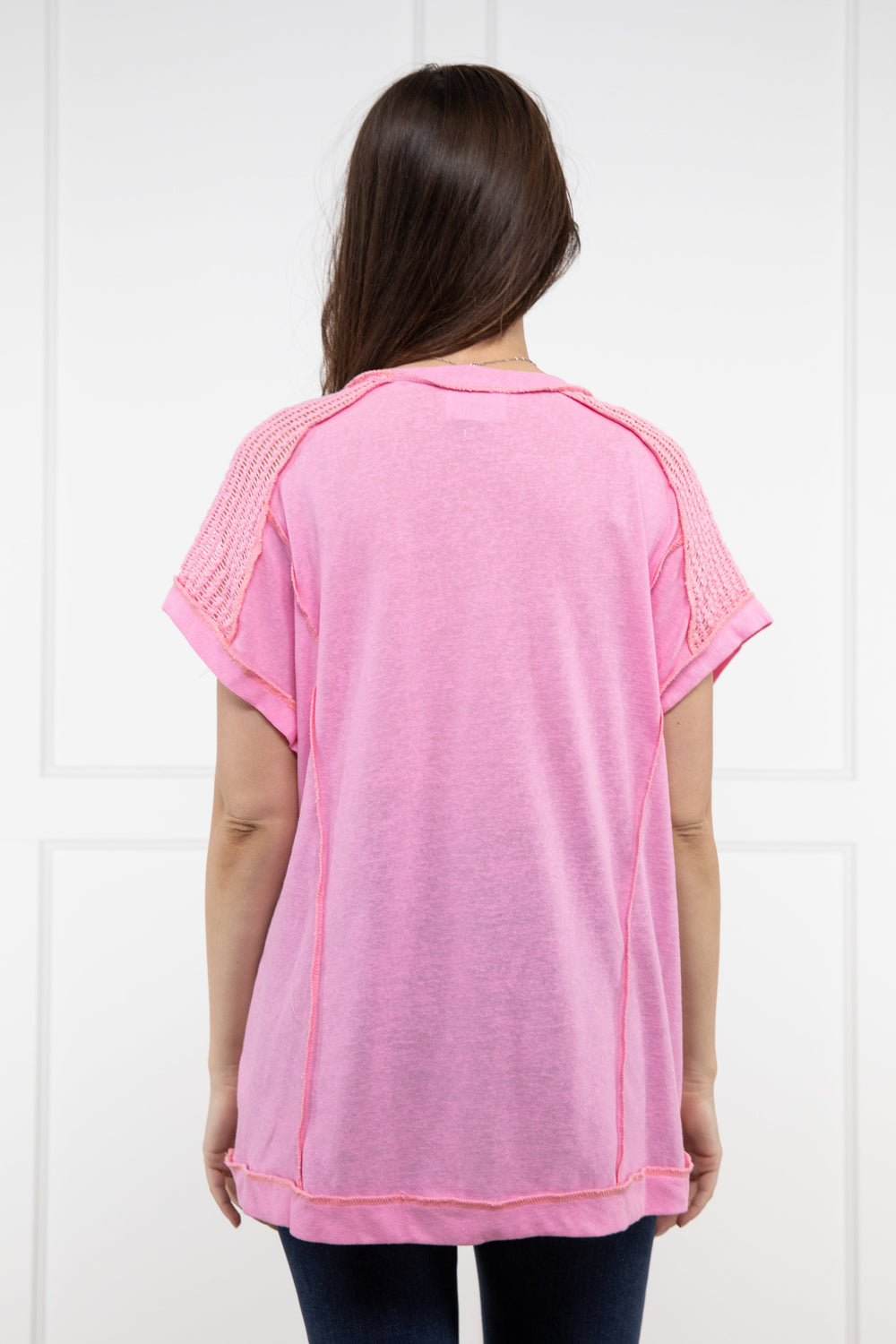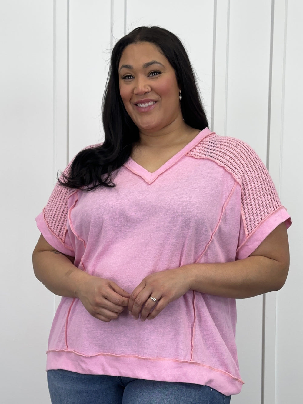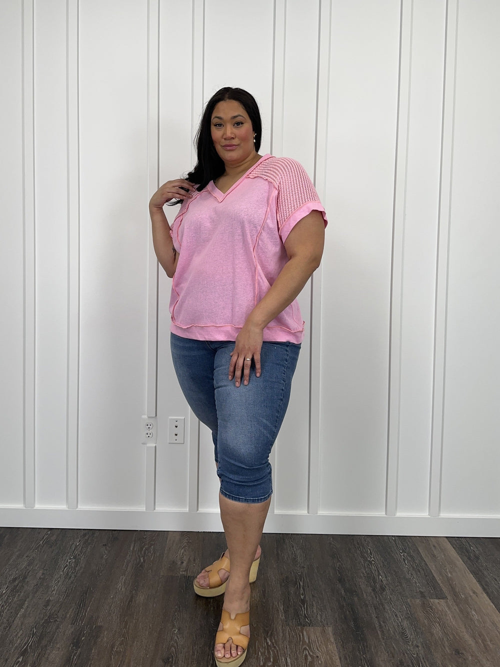 The Relax With Me Top from Andree By Unit will have you feeling stylish but comfortable all day. It features a V-neckline, overlock edge details, dolman short sleeves, and knit details on both shoulders. Pair it with your favorite lounge bottoms, wide leg denim, or denim shorts and sneakers or sandals.