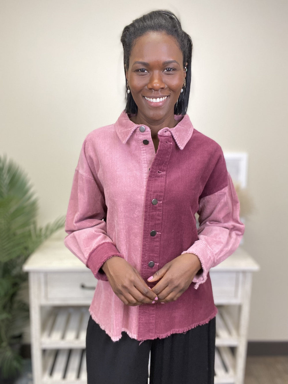 The Restless Heart Corduroy Shacket by Easel is a beautiful dark pink and rich raspberry, color block shacket to spice up your new wardrobe! This wide ribbed corduroy shacket features a petite collar, rear pleat, double seam at the relaxed shoulder, raw edge button cuff, dark metal buttons down the front and raw edge hi/lo hem. Perfect to wear layered or by itself with all your favorite denim!