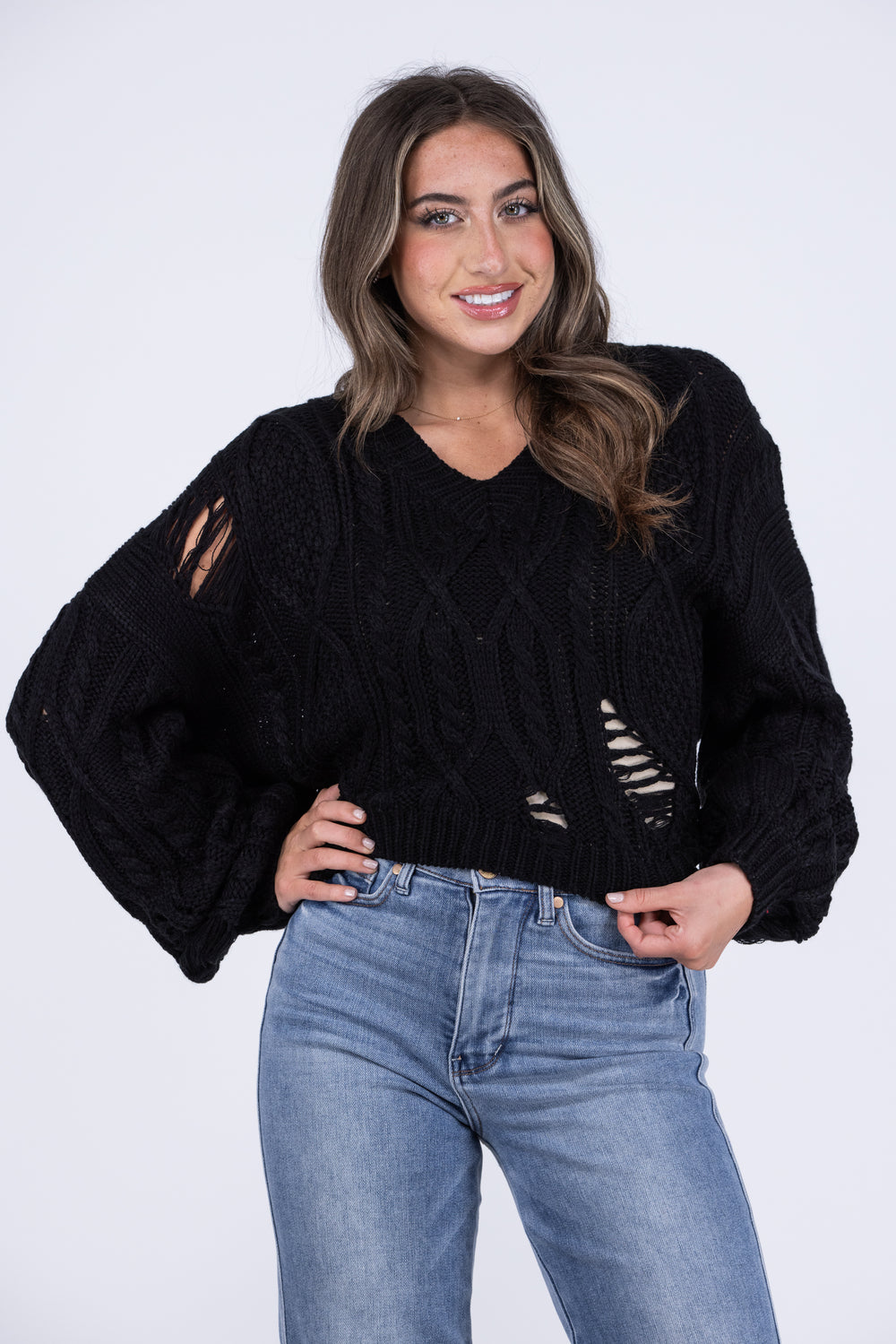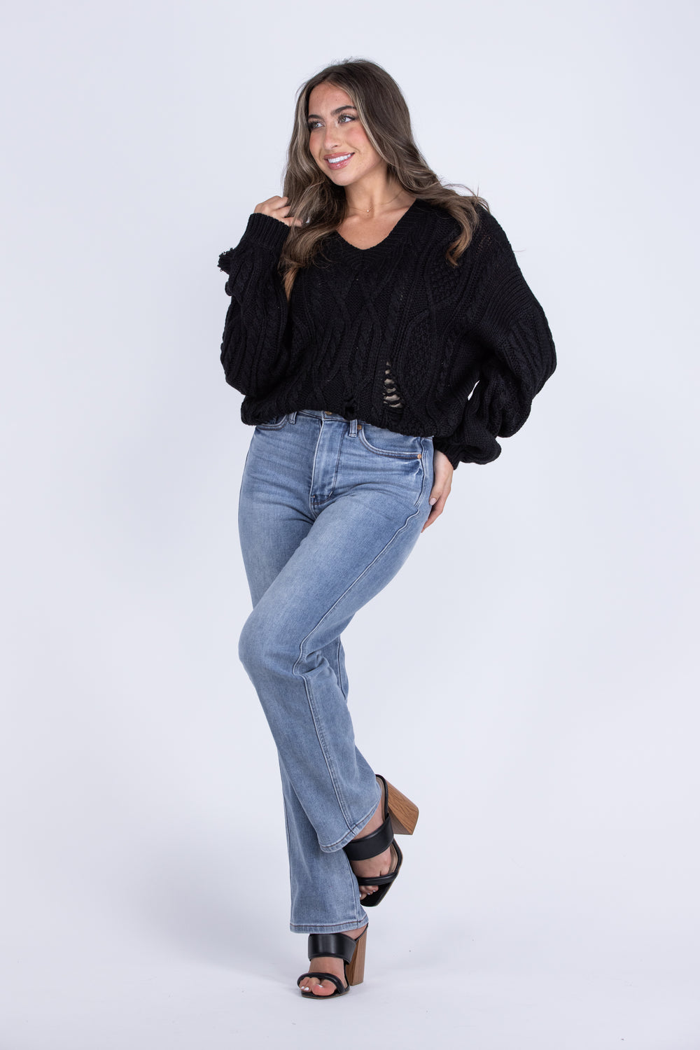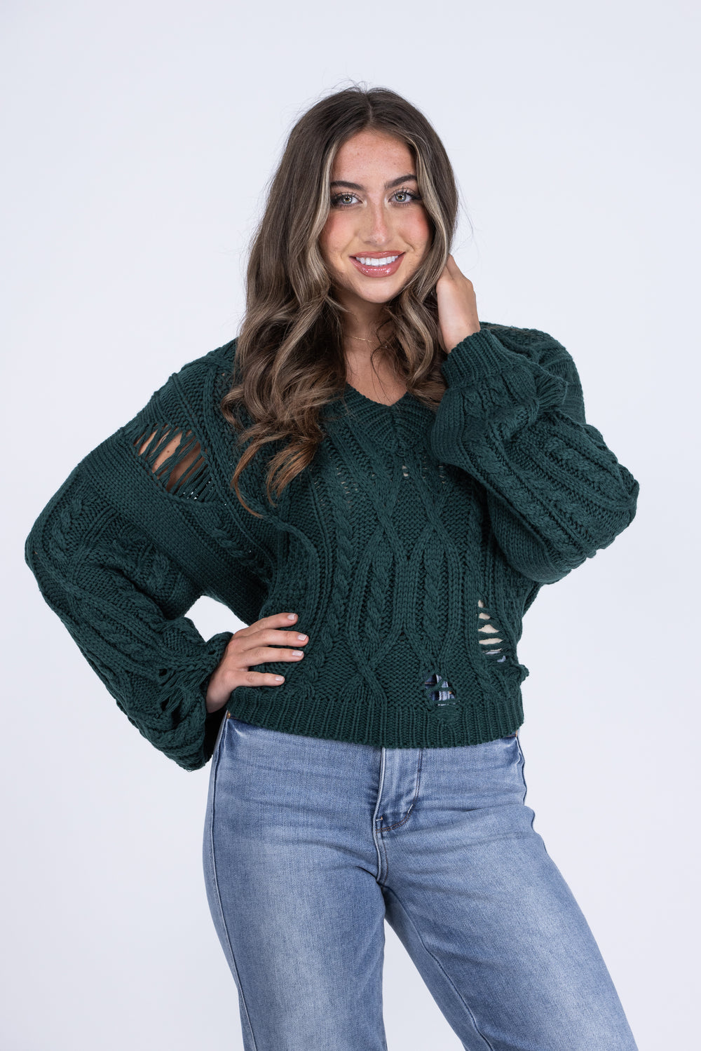 The Ripping Through Time Sweater by Miracle is great for stylish layering in various weather as you run errands. It features an open knit pattern, a ribbed design along the cuffs, neckline and hem, a V-neck, and a drop shoulder with a slight puff design by the wrist. Pair with light denim and booties for a comfortable day running errands around town.