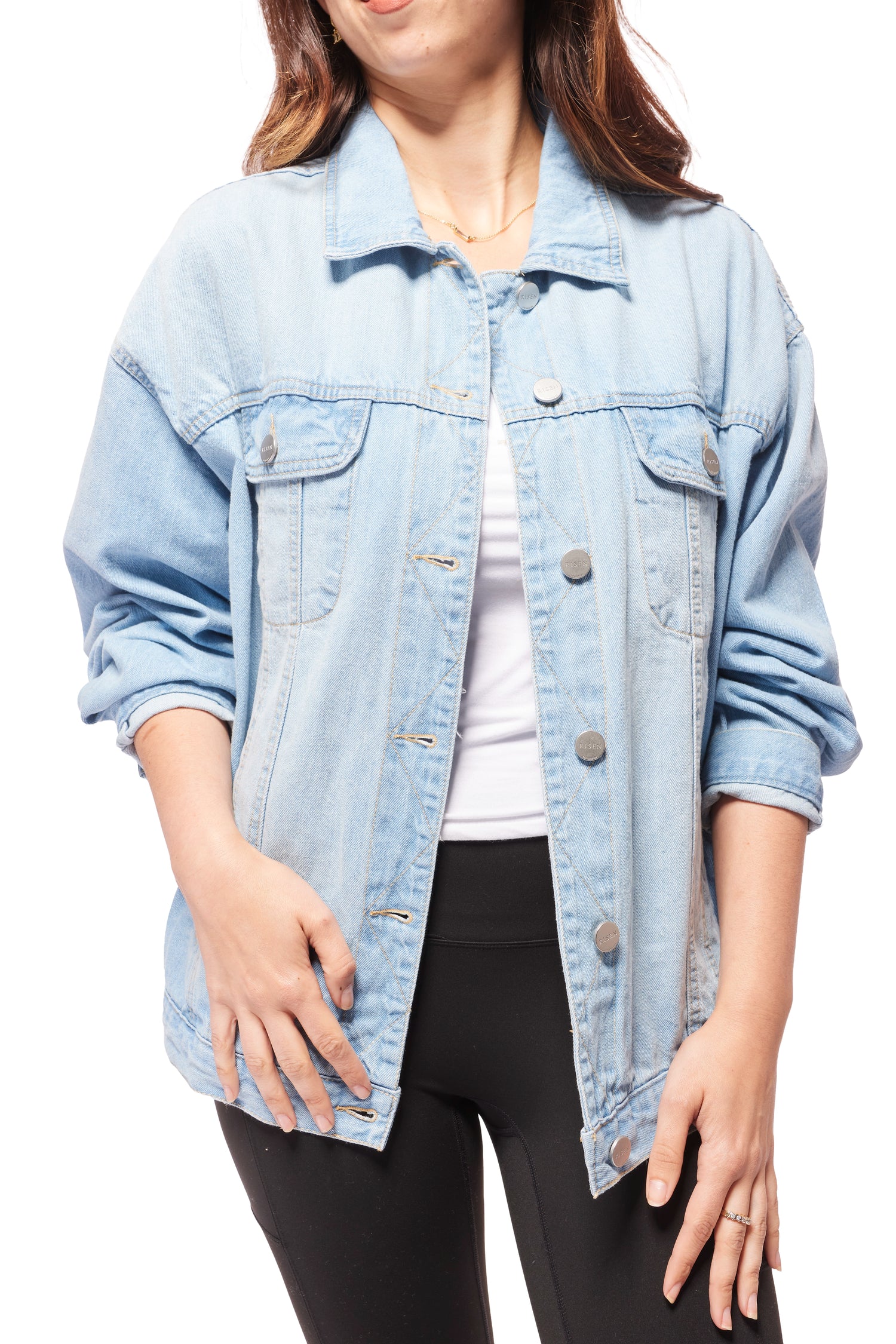 Grab this classic denim jacket from Risen for a classic touch over your favorite outfits. Featuring button cuffs and button-front chest pockets, this timeless jacket offers both style and practicality. Its versatile design pairs effortlessly with any outfit, making it a must-have for everyday wear. Durable denim ensures lasting comfort and a flattering fit that complements your silhouette.