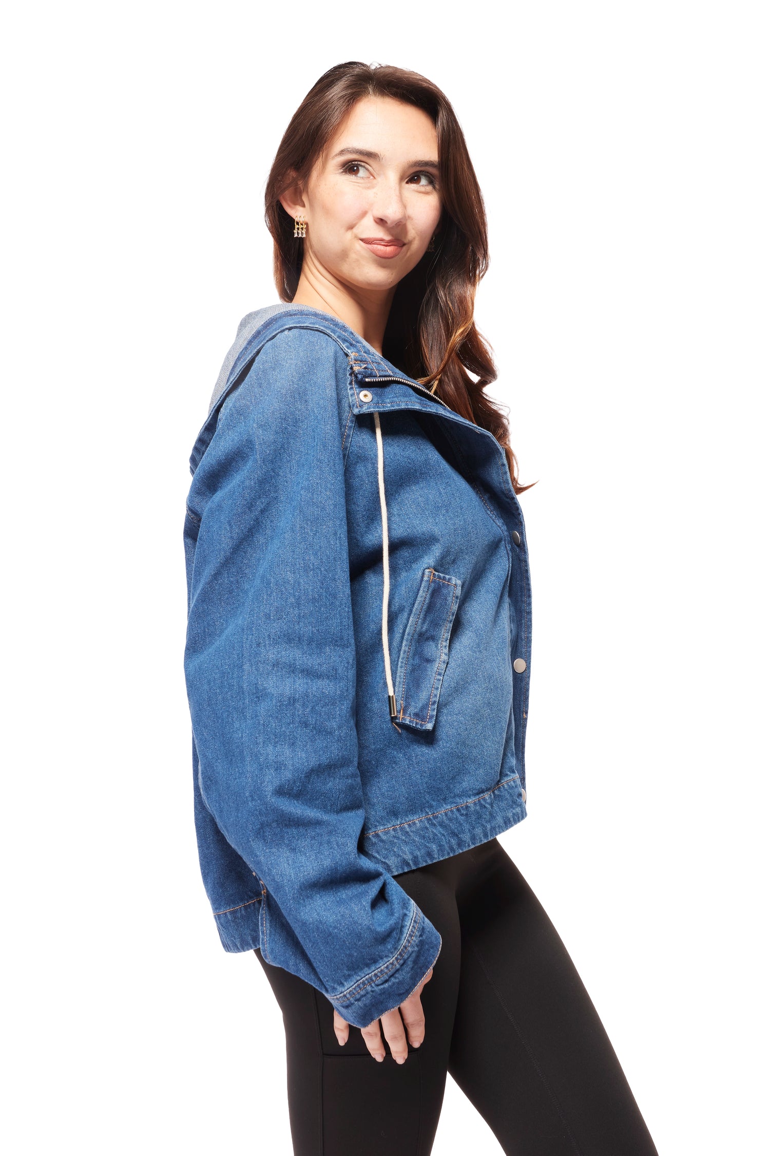 This denim jacket from Risen in dark wash combines edgy style with practical design. Featuring both a zip-up front and button closures, this jacket offers versatile wear options. Its oversized fit and raglan sleeves ensure comfort and freedom of movement, while the drawstring hood adds a casual touch. Button cuffs and pockets complete the look, making it a must-have layering piece for effortless, everyday style.