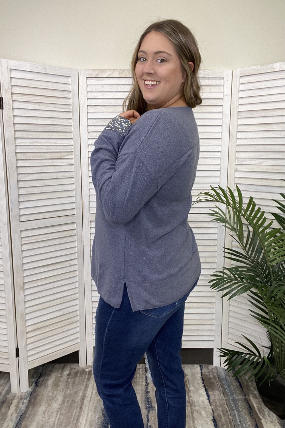 The Rising Sun Top by Cotton Bleu will be the talk of the season! This top features a rounded neckline and beautiful long sleeves in a brushed hacci. The floral contrast cuffs are a hidden treasure, perfectly paired with flattering side slits!