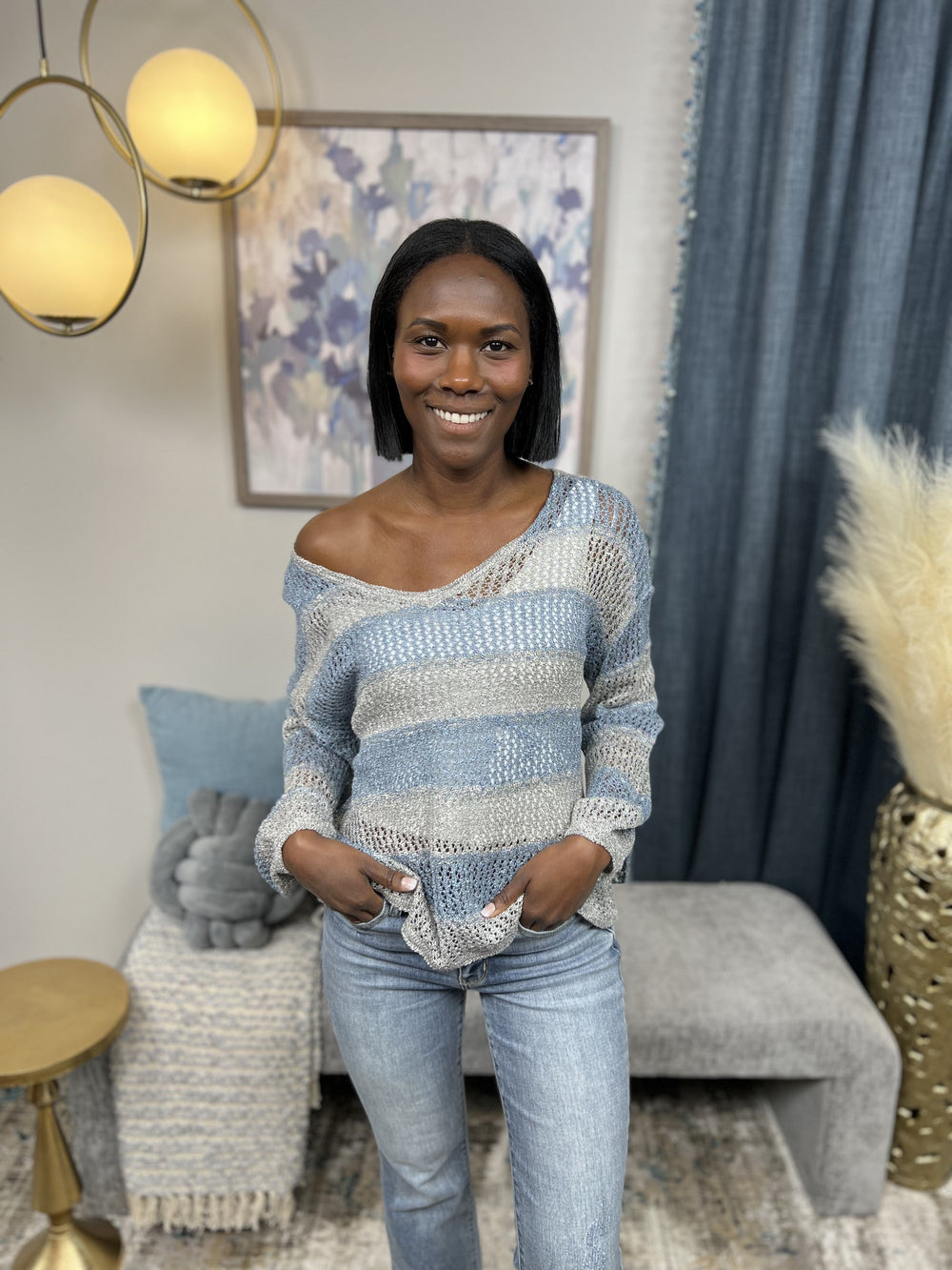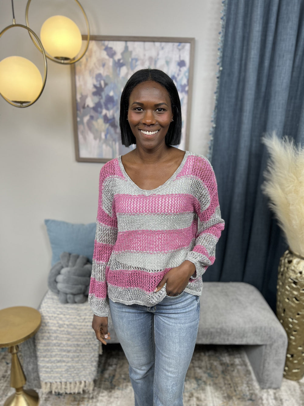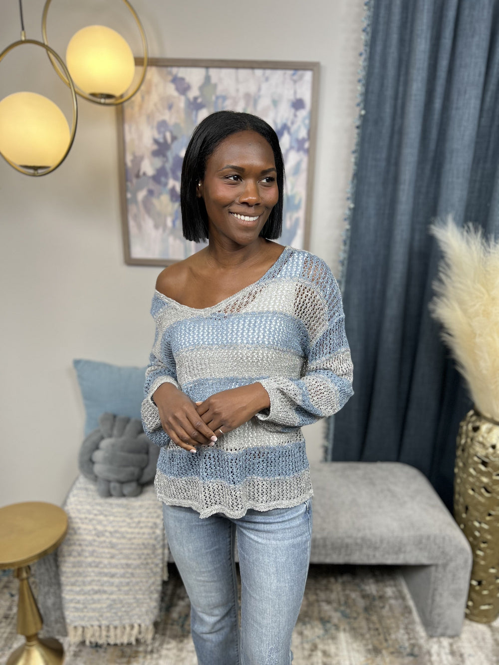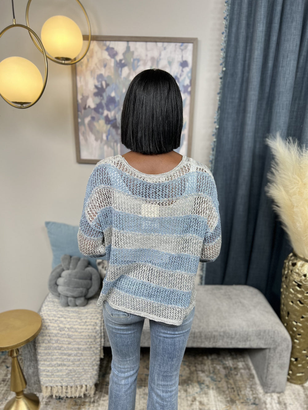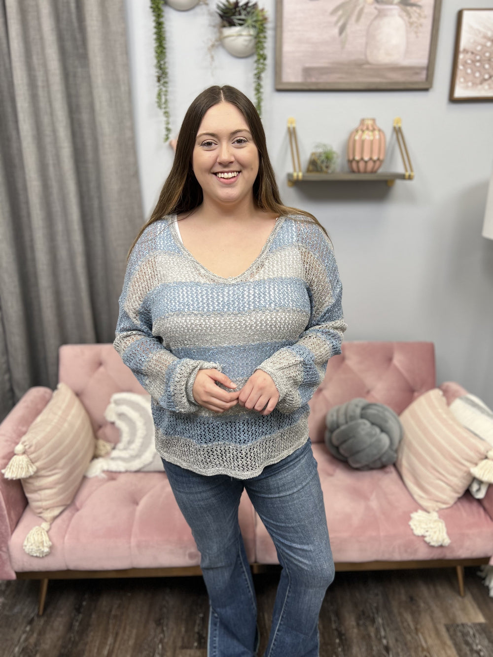 The Said It All Sweater by Miracle says it all! This beautiful striped sweater features an open knit, lightweight sheer fabric, long balloon sleeves, V neckline that is perfect for easy off the shoulder wear and a straight hemline. Pair over your favorite tank or cami, denim shorts and sandals! The Said It All Sweater is perfect for those nights when it gets a little chill or being out by the fire!