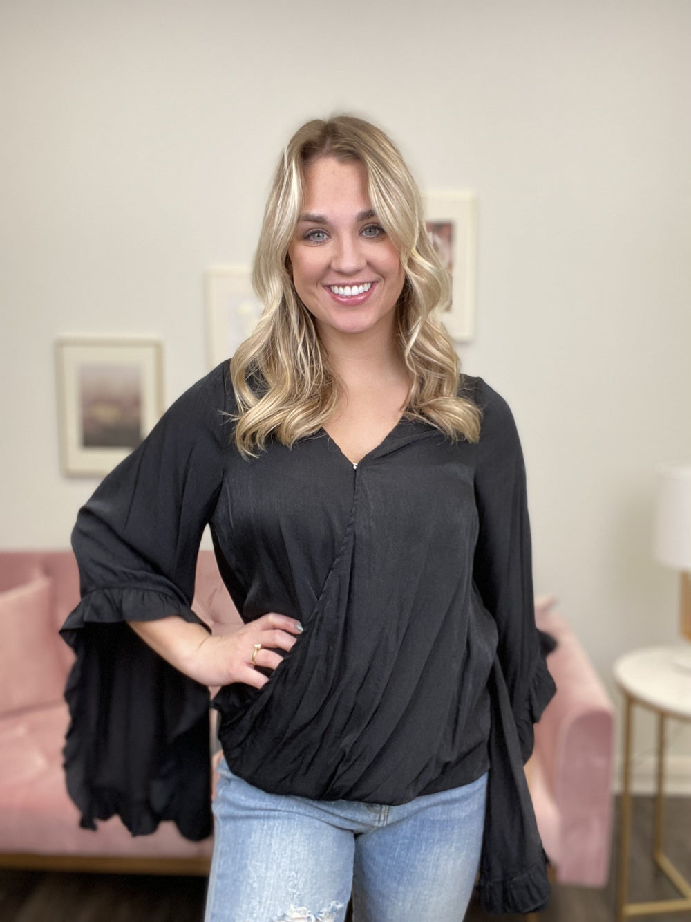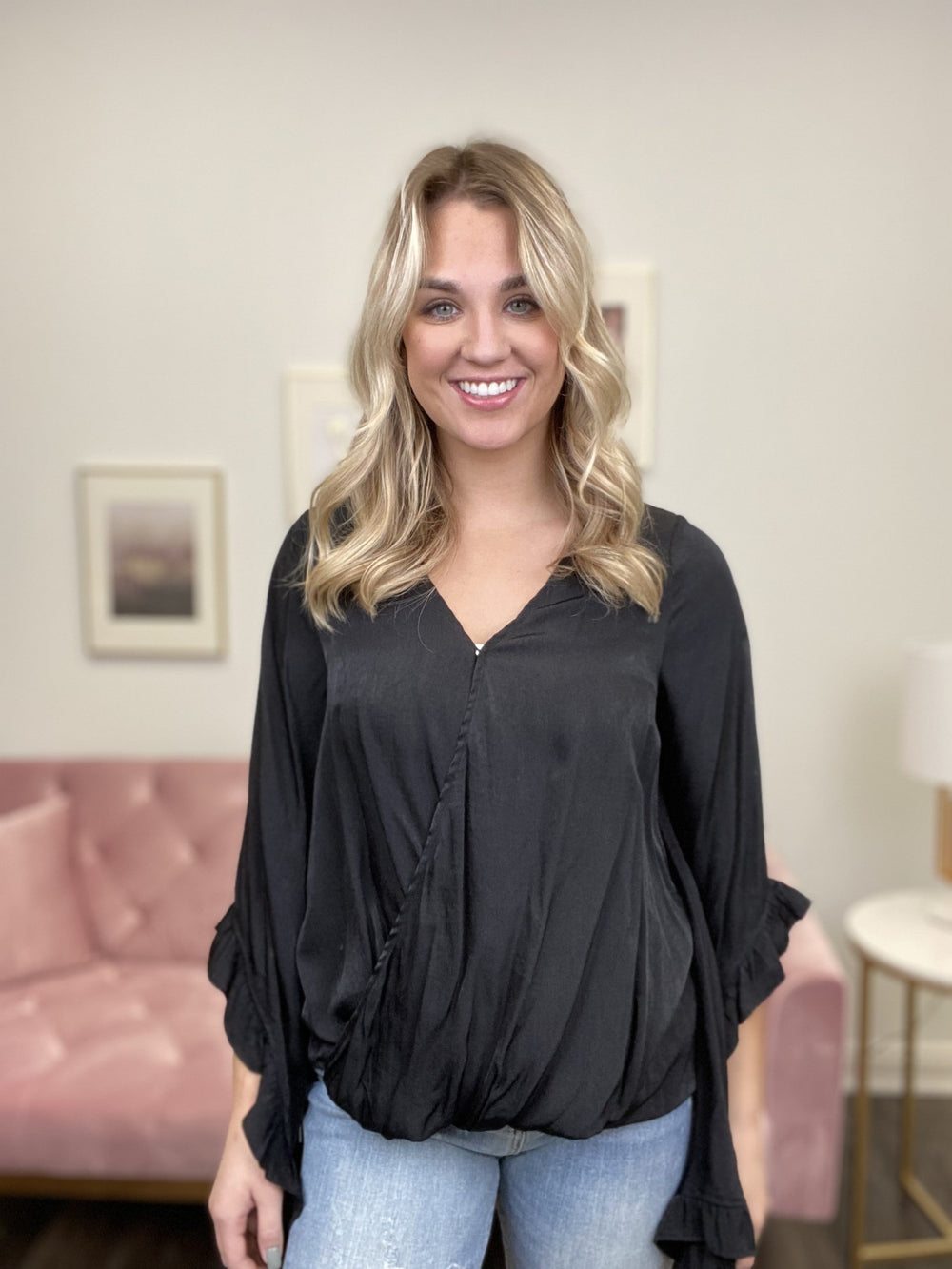 This blouse by Oddi is the perfect top for any occasion. It features a surplice style with a button in the front for closure, flowy front, longer back, wavy long bell sleeves, and a V-neckline. This blouse can be dressed up or down!