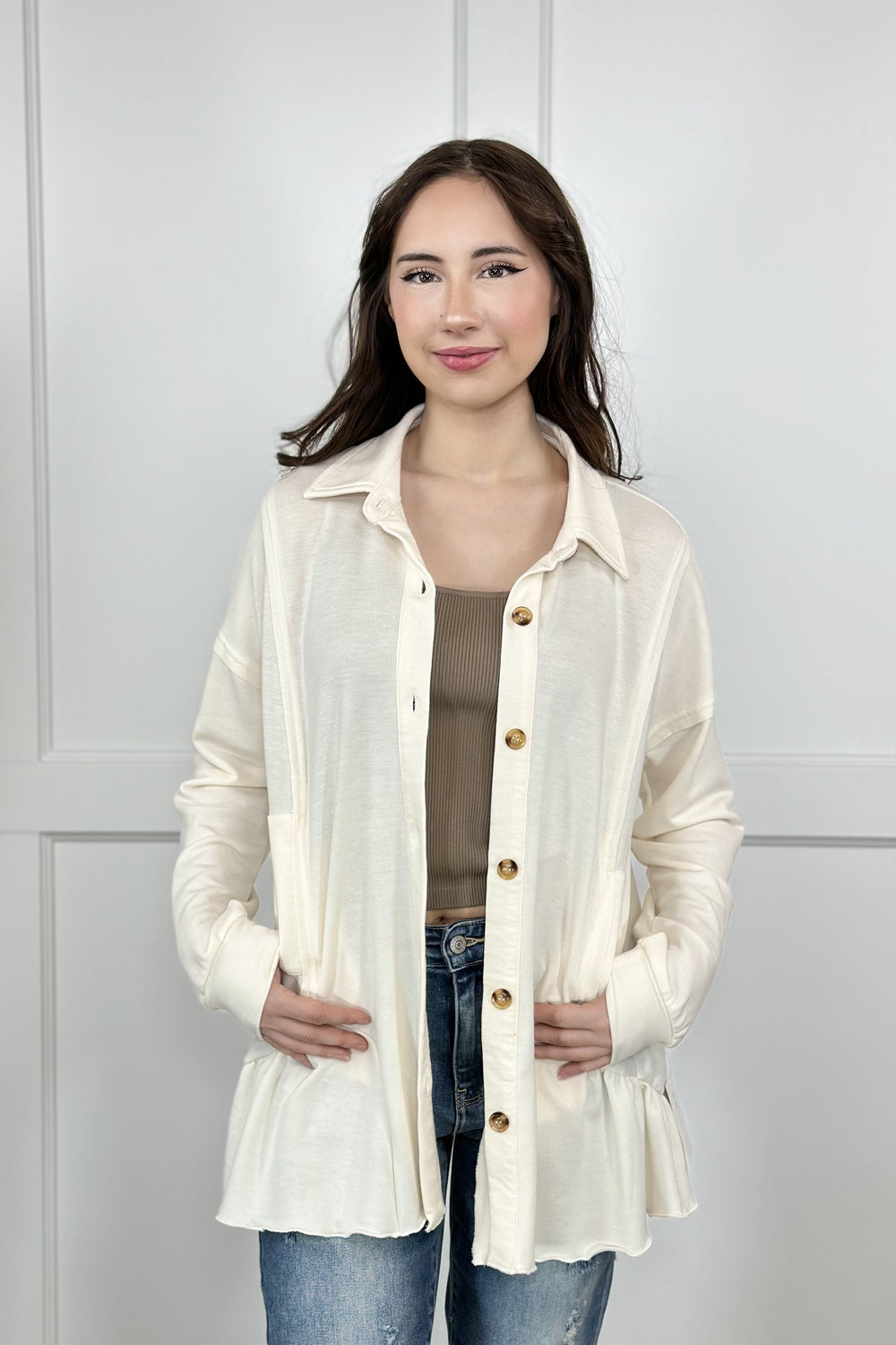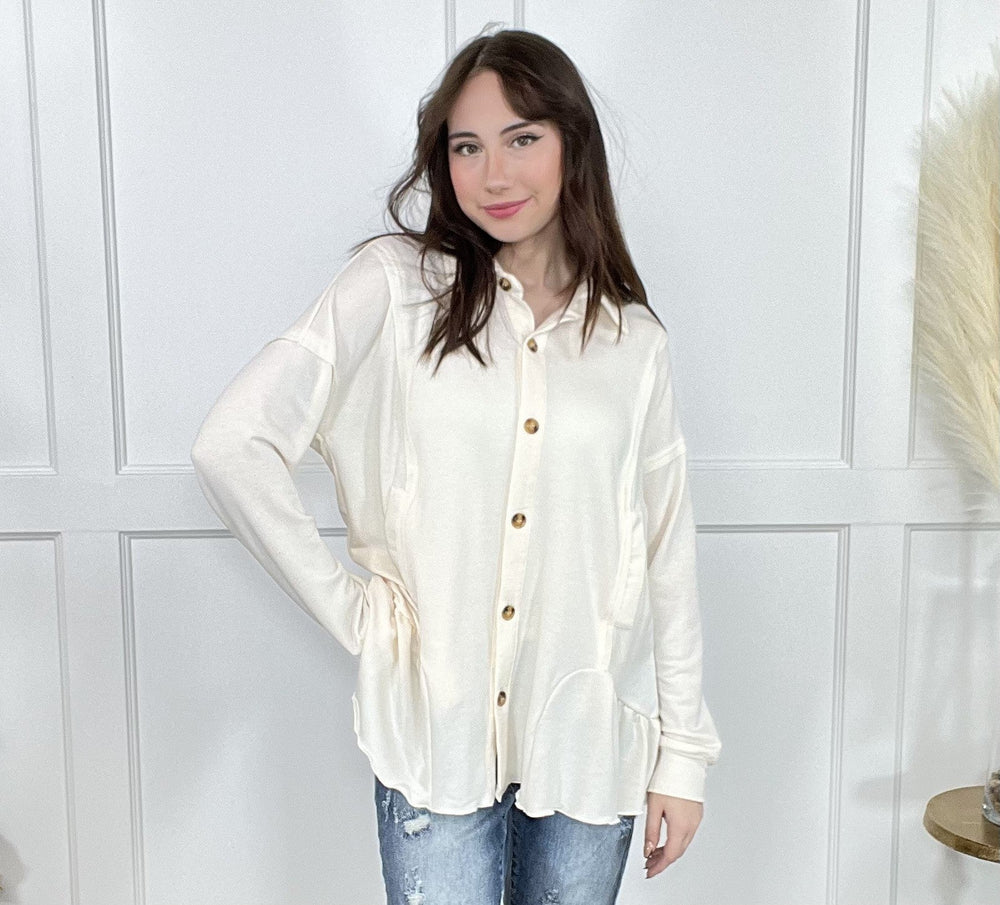 You'll be ready to settle down in this cute and cozy top from Heyson! The Settle Down Sweetheart Shacket features a soft material with flattering exposed seamlines, front pockets, functional buttons and a super cute flare hem! This shacket is perfect to wear on its own with your favorite denim or wear over top one of our comfy seamless tanks from By Together for a pop of color to a stylish layered look.
