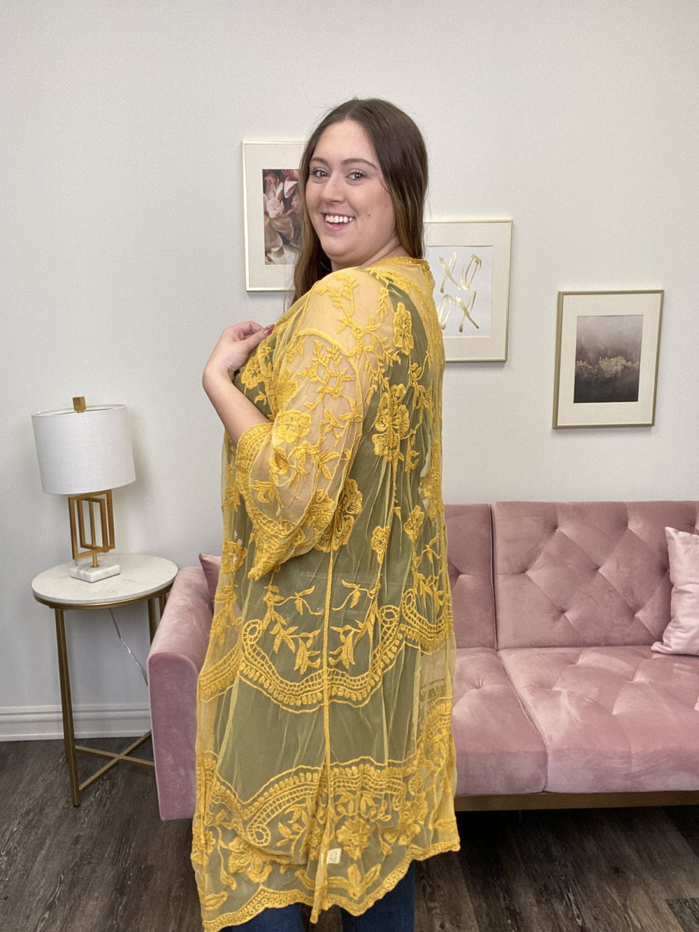 The Sheer Lace Kimono By Davi & Dani is a Baroque Boho Sheer Crochet Lace Kimono. It features a 3/4 sleeve with an open front and center strings to tie. It is a longline maxi kimono cardigan. The fabric is soft and drapes well making it perfect for any outfit!