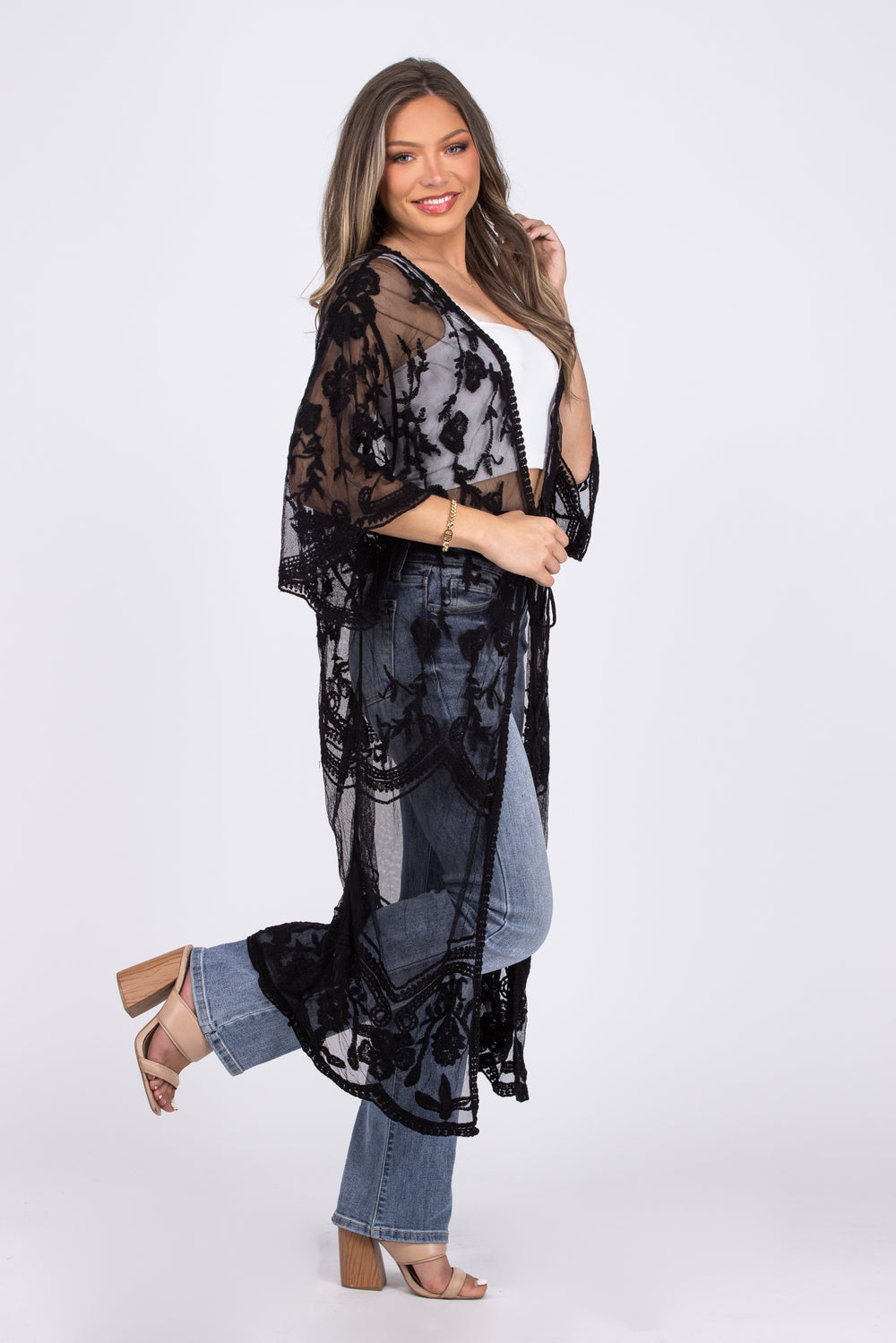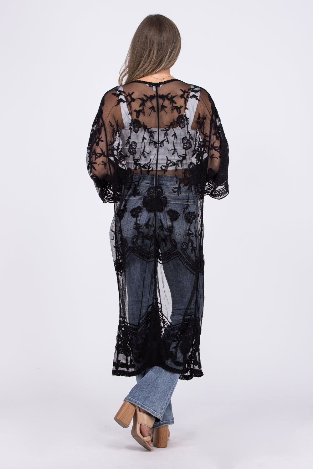 The Sheer Perfection Kimono is a baroque boho sheer crochet lace kimono. It features a 3/4 sleeve with an open front and center strings to tie. It is a longline maxi kimono cardigan. The fabric is soft and drapes well. The Sheer Perfection Kimono would be great as a swimsuit cover up or paired with your favorite top for any occasion!