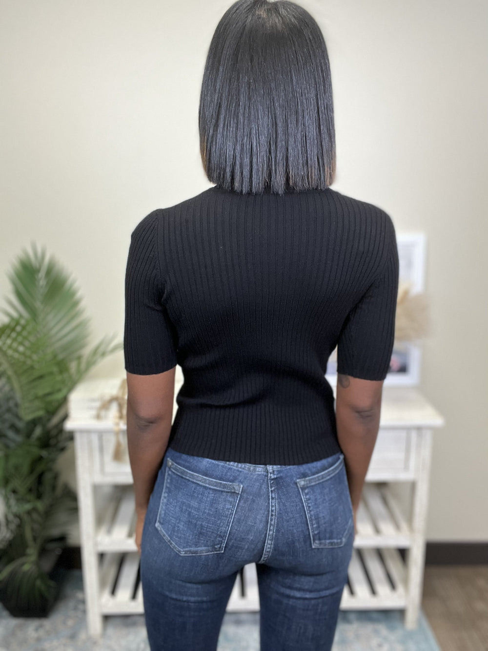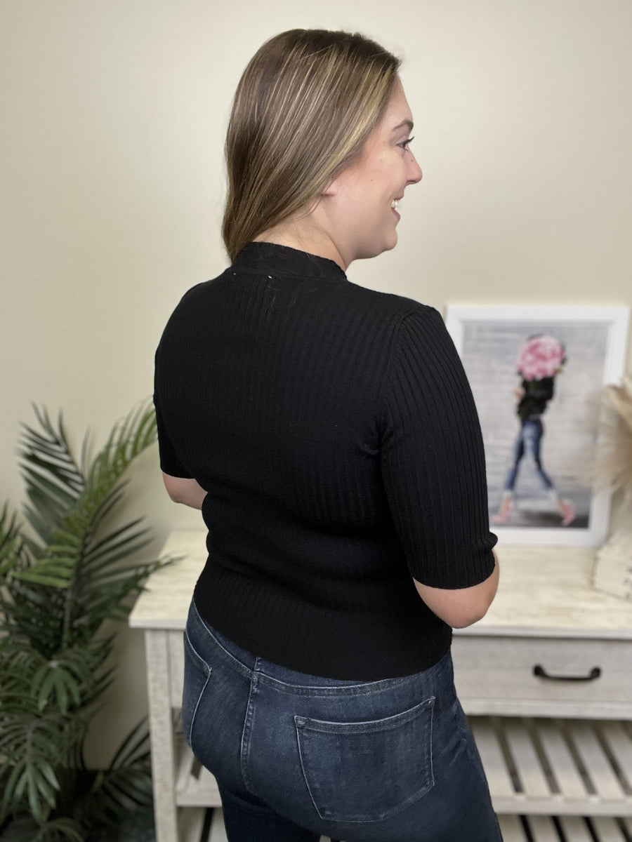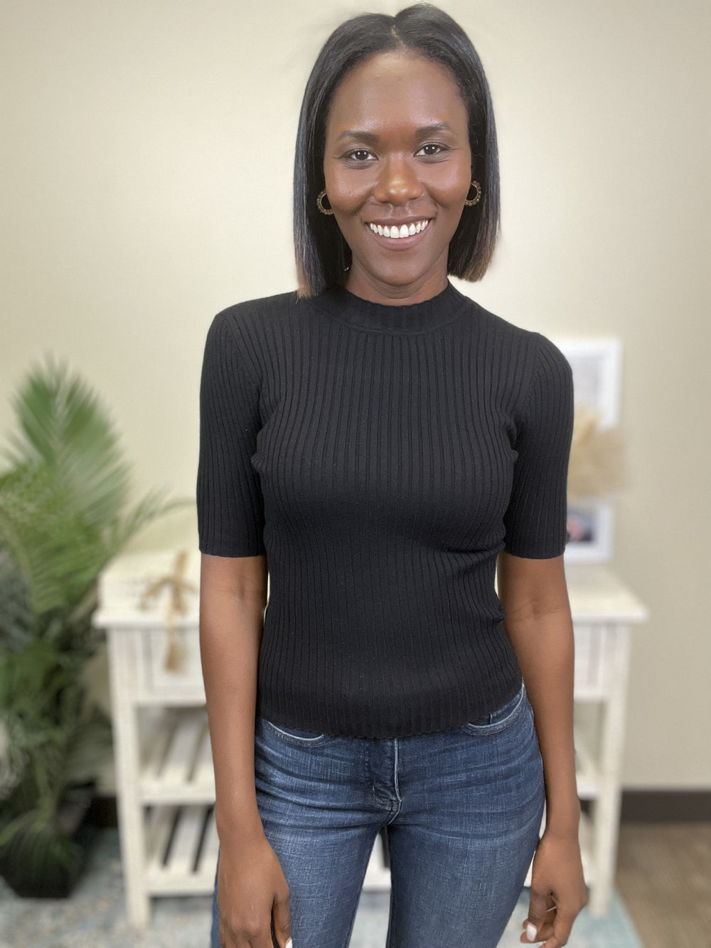 You will wear the She's Cool Sweater the whole year! This mock neck sweater features short sleeves and stretchy bodice. Wear this top alone or with a cardi or jacket and feel cool however you style it!