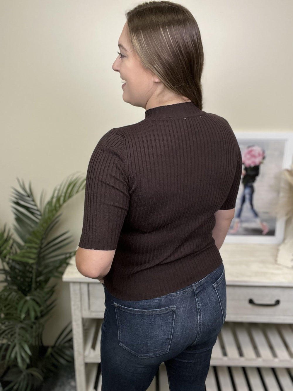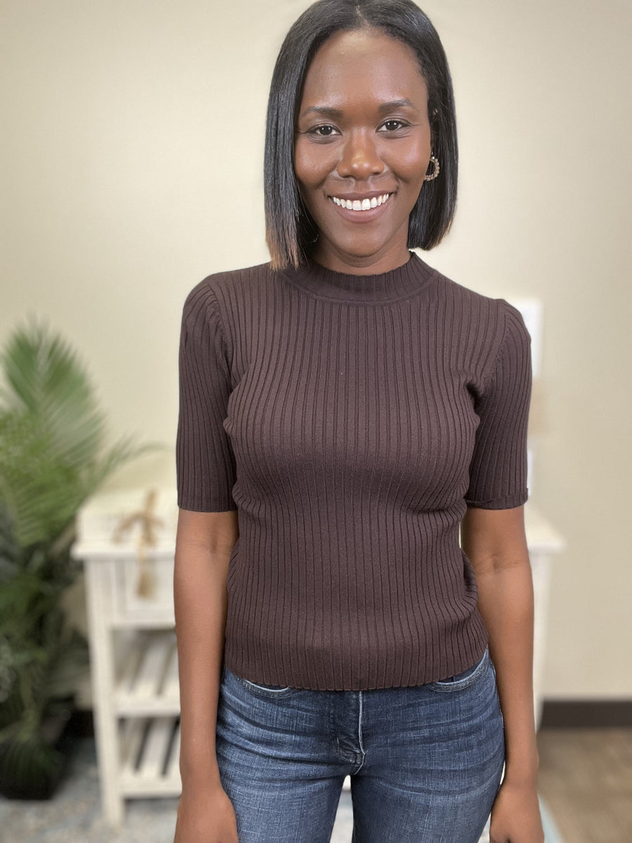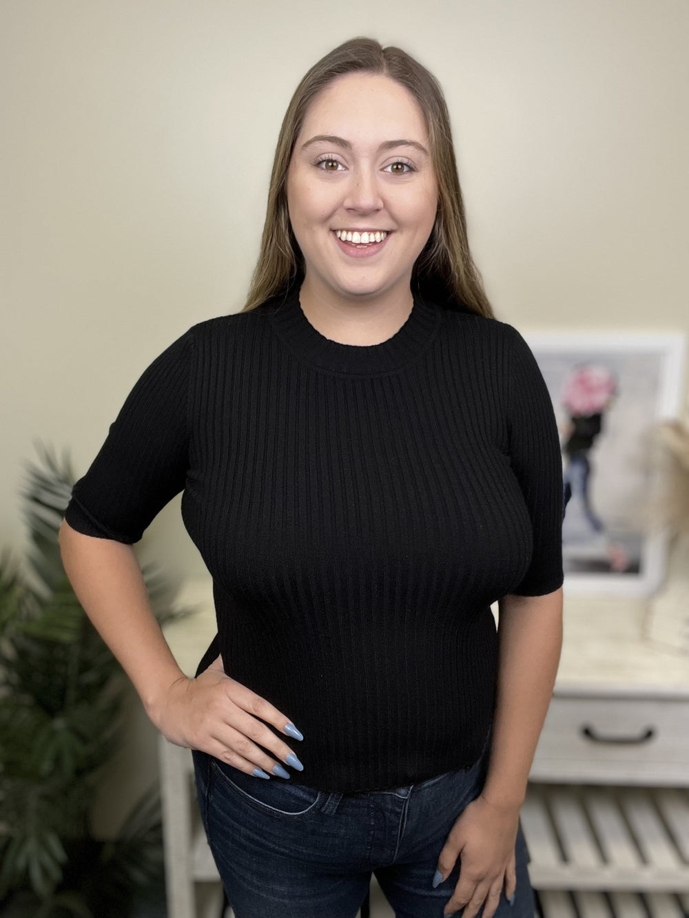 You will wear the She's Cool Sweater the whole year! This mock neck sweater features short sleeves and stretchy bodice. Wear this top alone or with a cardi or jacket and feel cool however you style it!