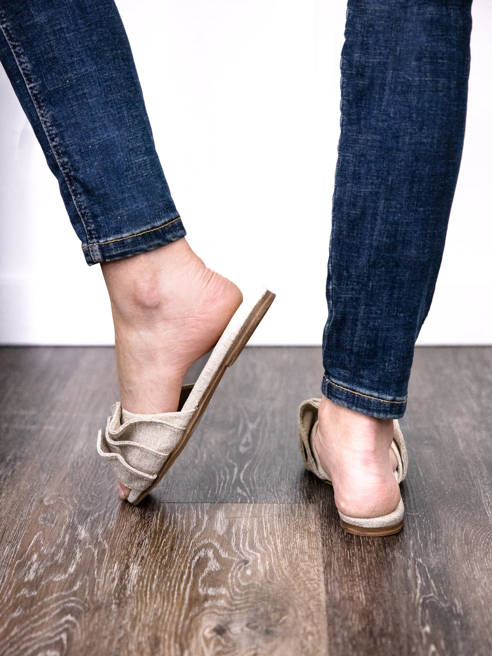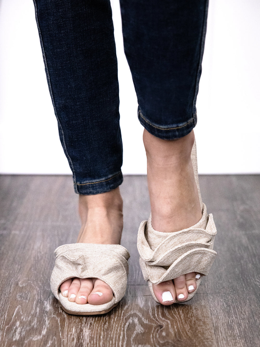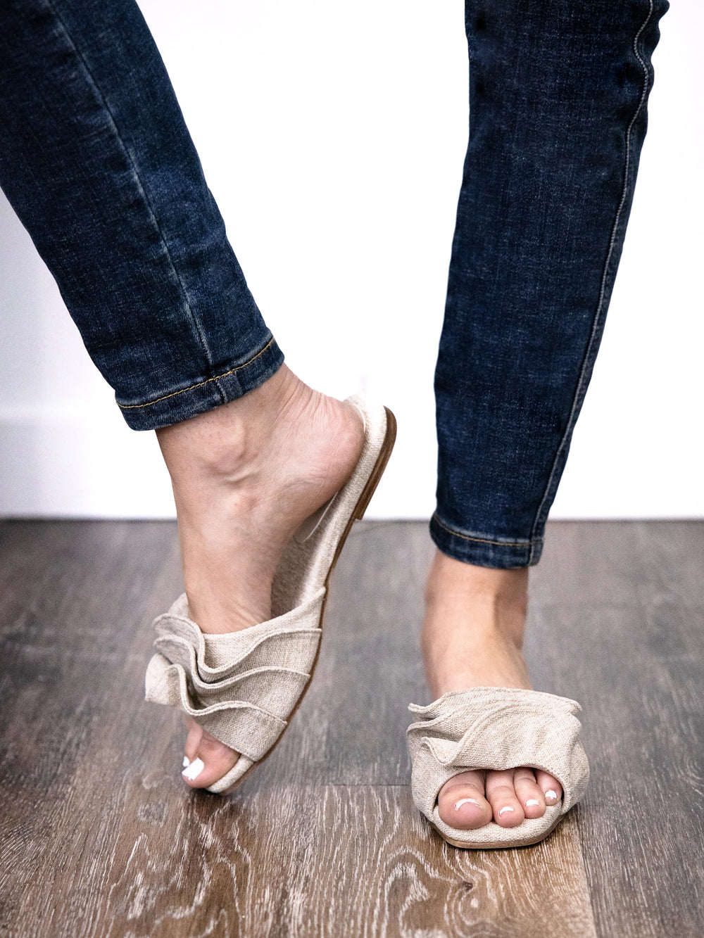 Slip into some serious fun with the Shu Shop Daisy woven-like textured fabric Ruffle Open Toed Sandal. With a square toe for added style and just enough "smush", these slide-on sandals are perfect for any occasion. Get ready to turn heads and make a statement without sacrificing comfort.