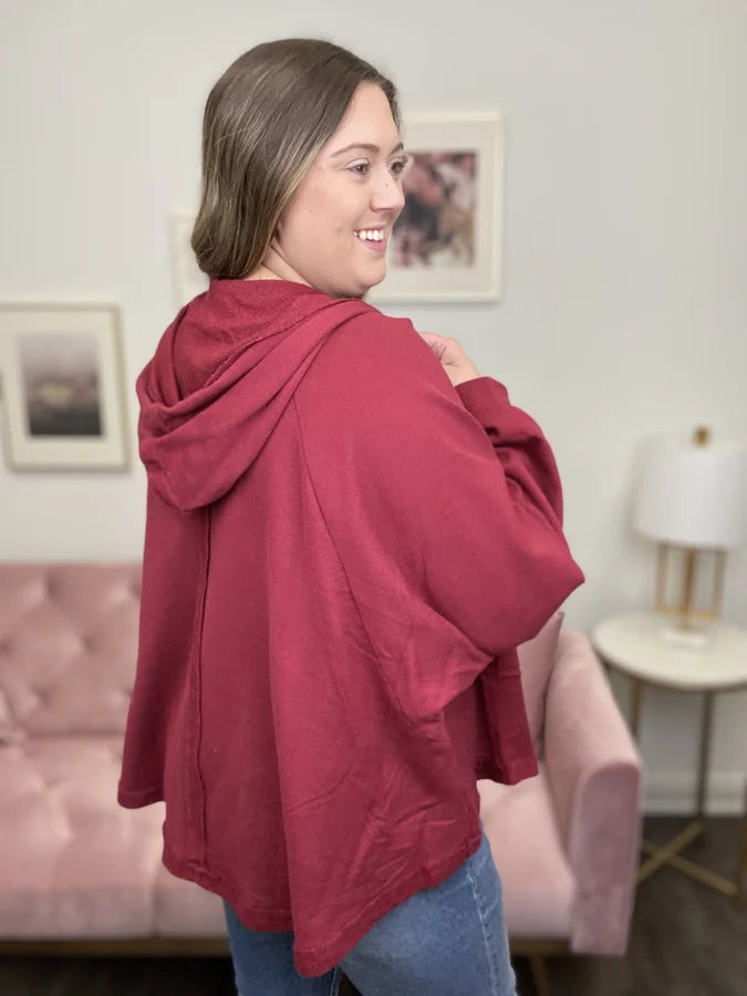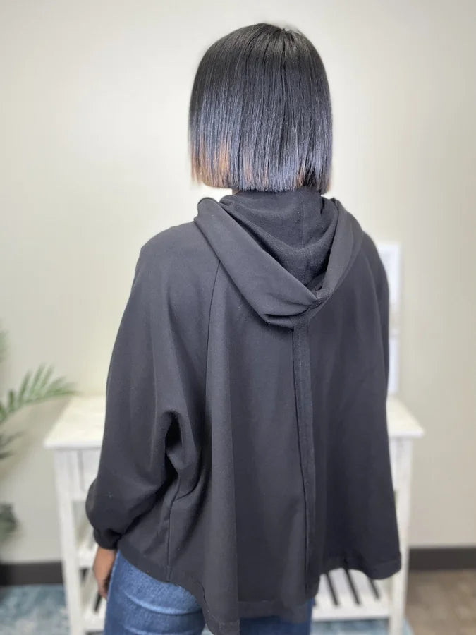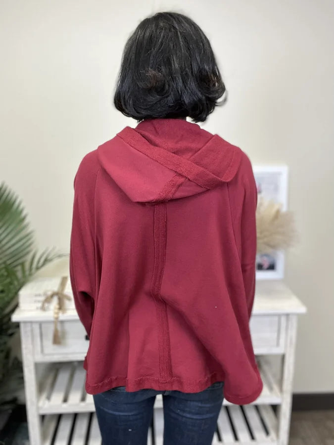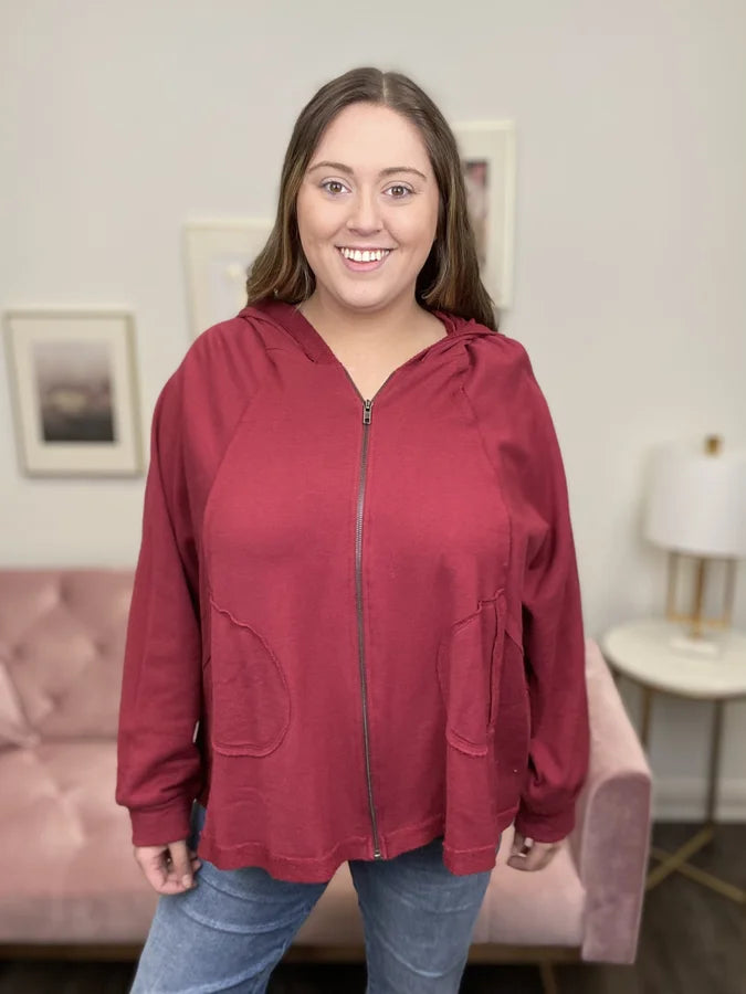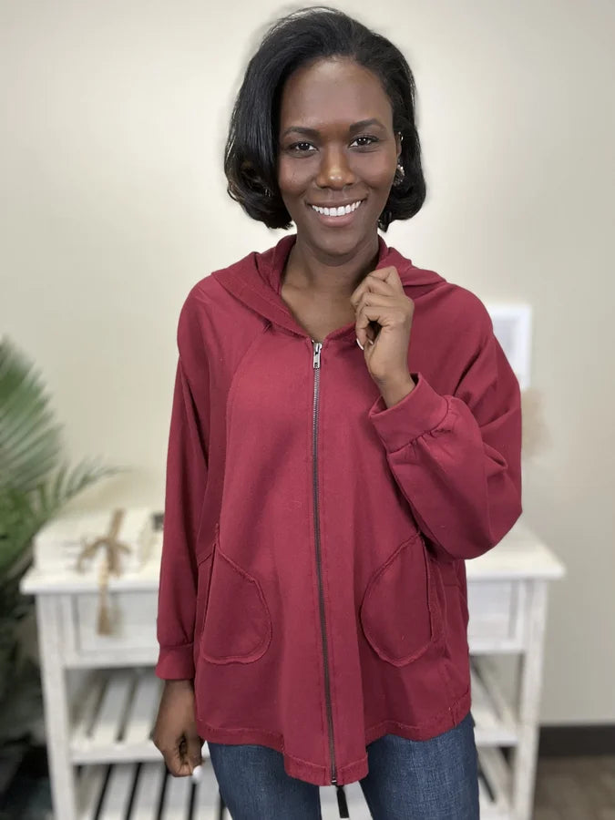 The Simple Embrace Hoodie by Ces Femme is a solid long sleeve hoodie sweatshirt featuring banded cuffs, zipper front, and raw edge detail with high low hemline. Embrace style and comfort with this hoodie! Perfect for pairing with denim or leggings and as a layering piece.