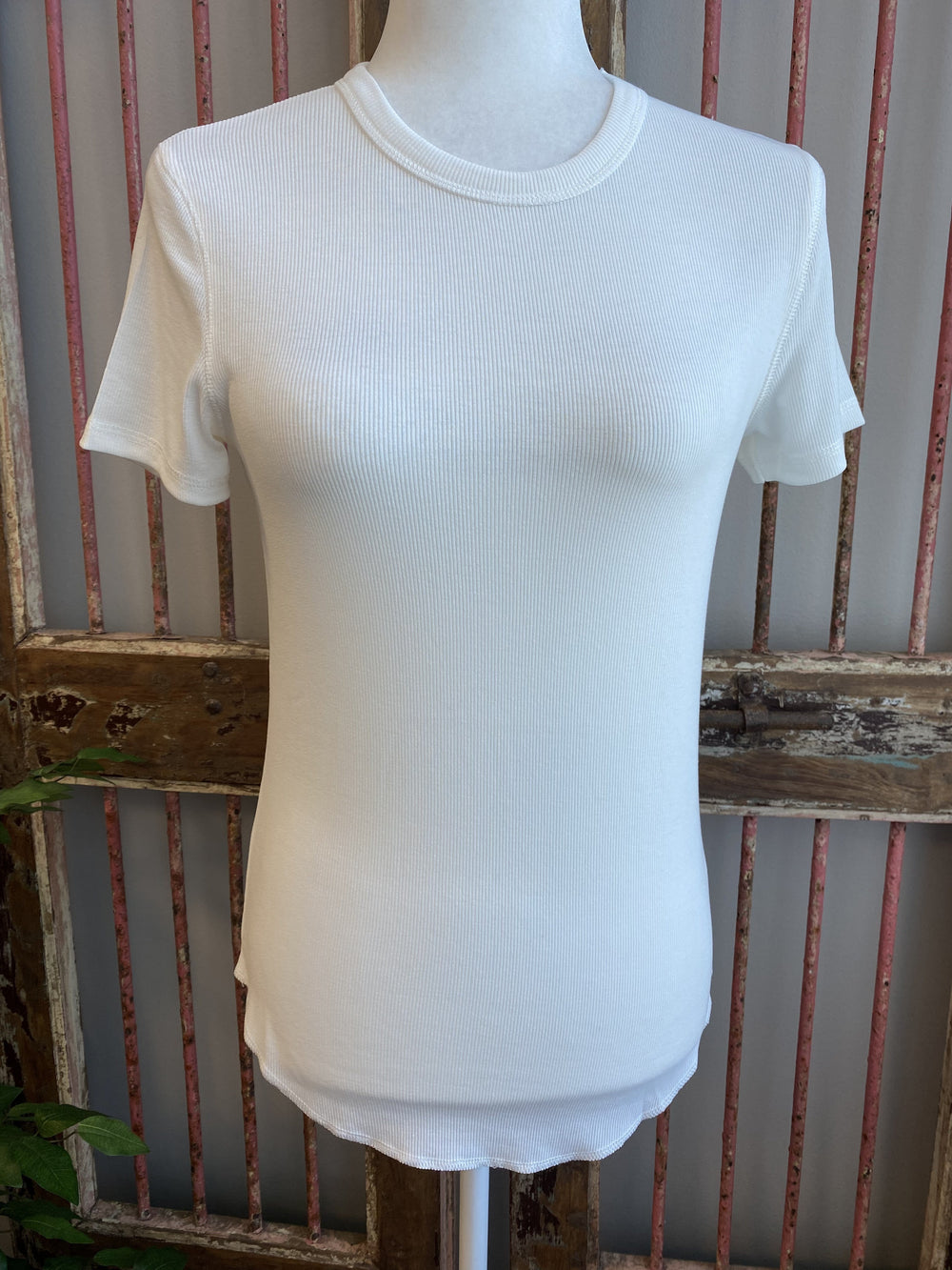 The Simply Put Top By Wishlist is a a solid ribbed knit basic tee. It features a round neckline and short sleeves.