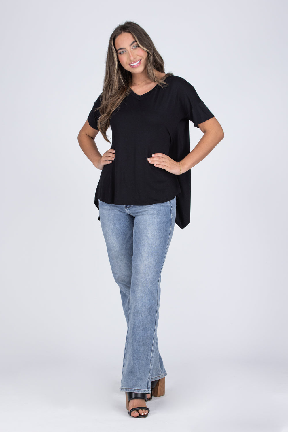 The Simply You Top by Sew in Love is a solid tee. It features a V neckline, short sleeves, a slight round hemline, and an over lapped open back. This top is perfect to pair with your favorite leggings for a workout or to run errands for the day!