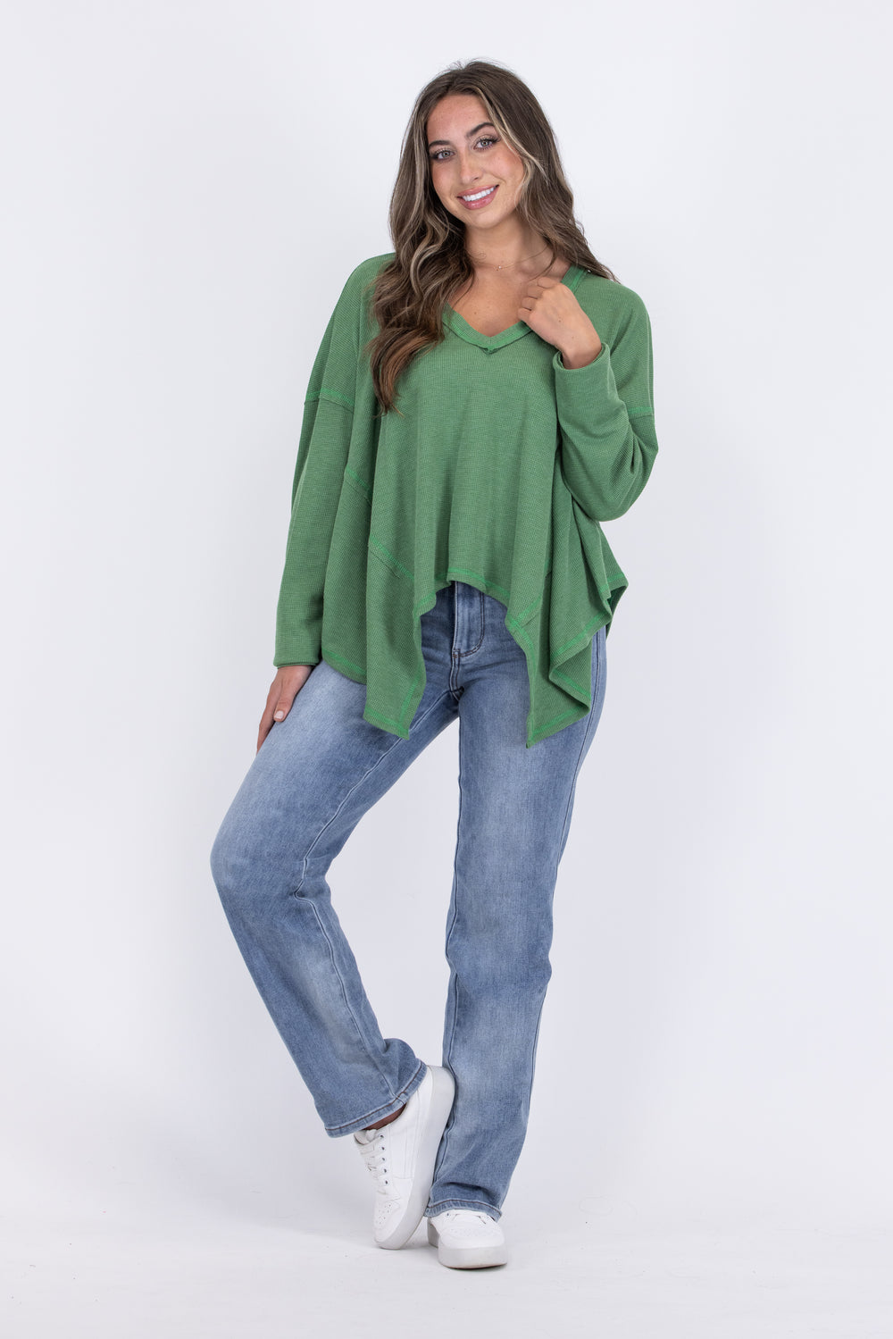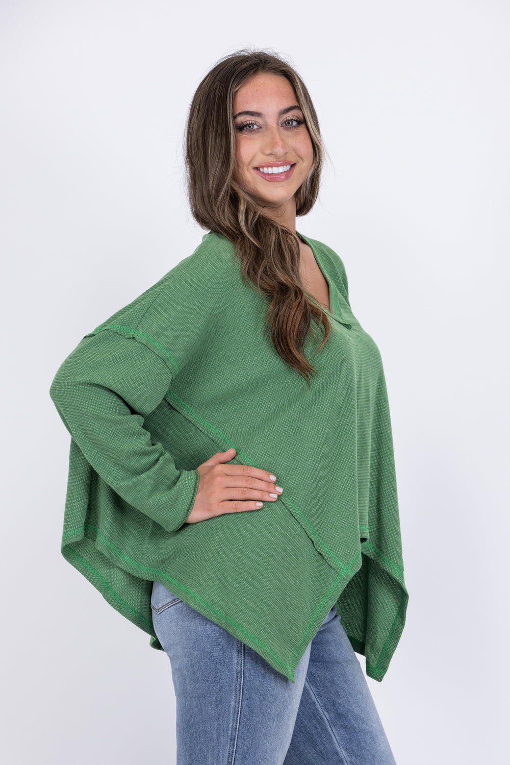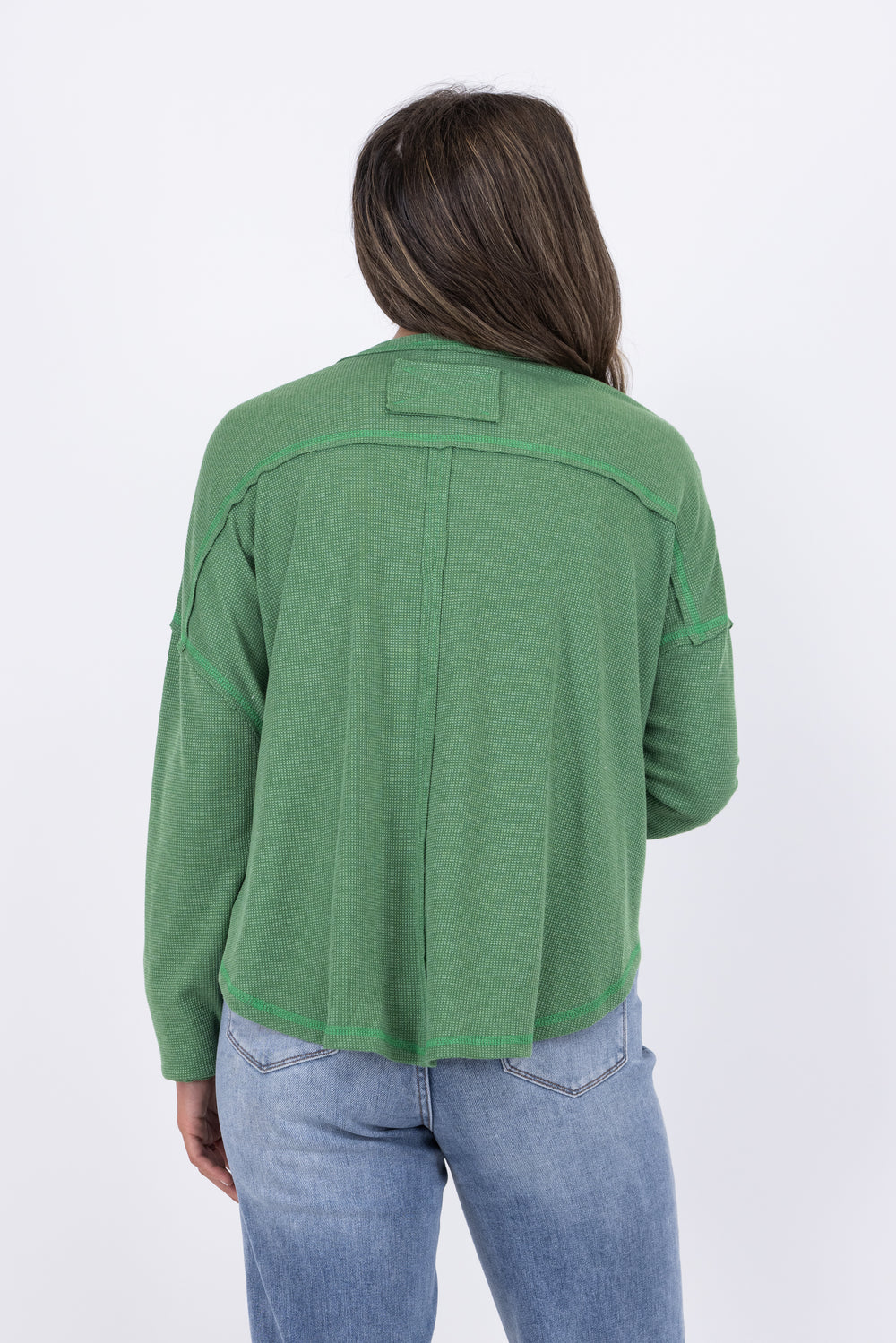 Get cozy with the Sit Back and Relax Top from Ces Femme. Made with knit thermal fabric, this top is perfect for chilly weather. The V-neck and raw stitch detail add a touch of style, while giving it a relaxed vibe. The oversized fit and box stitch at the back provide ultimate comfort. Pair with your favorite denim or leggings for the perfect relaxing day!