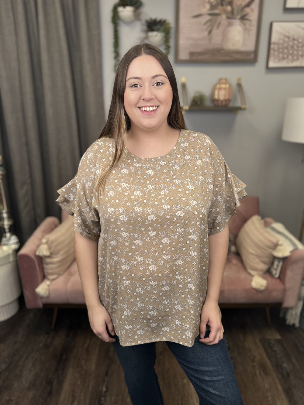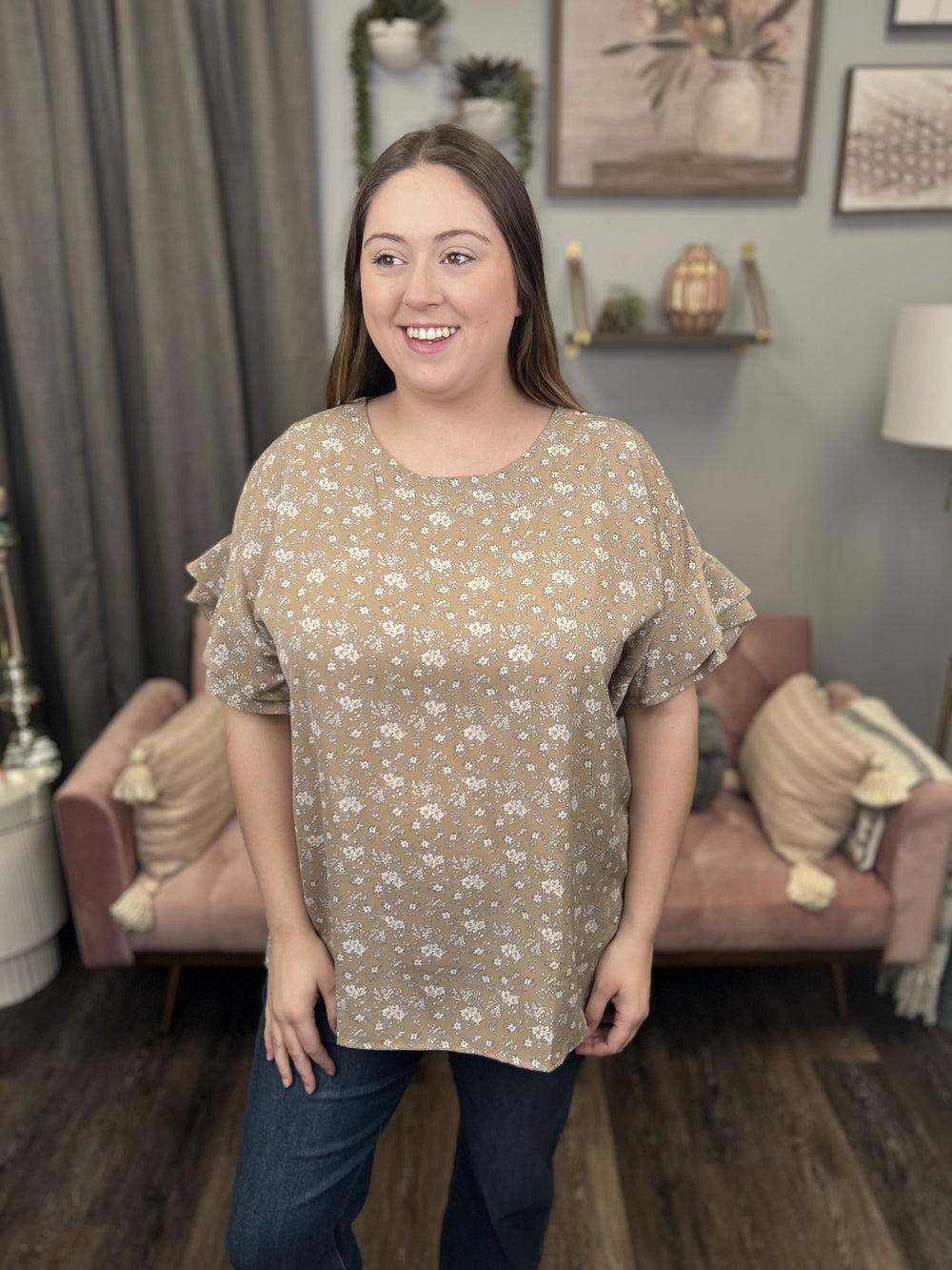 The Slow Motion Top By Cotton Bleu is a ditsy floral printed blouse top. It features short ruffled layered sleeves, round neckline, and back keyhole with button closure. This top would be perfect for summer or fall the colors are just perfect!