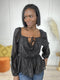 Star Struck At Midnight long sleeve top from Andree By Unit will enchant the best of us with its beauty. Features a square neckline, functional tie for a keyhole decollate, sheer puff long sleeves with fully lined body, and an empire waist with elastic waistband. Get ready to hit the town pairing it with straight leg denim and heels or your favorite skirt.