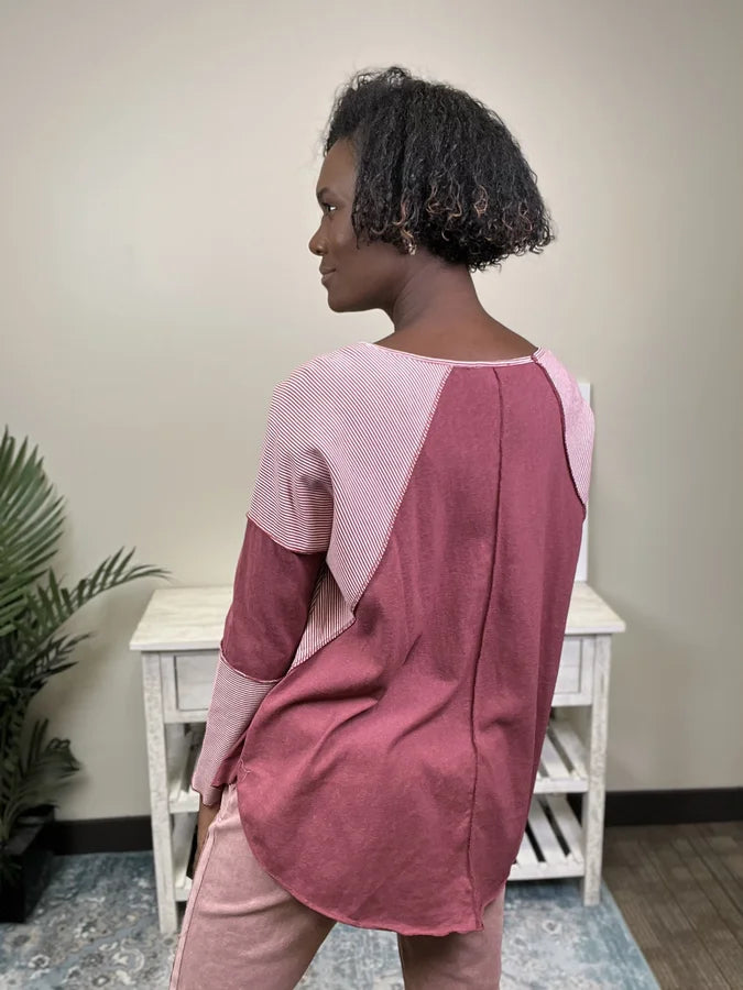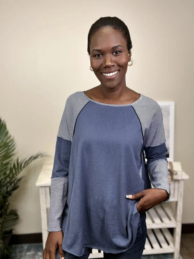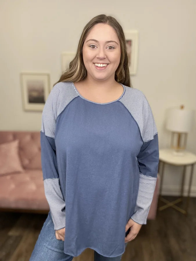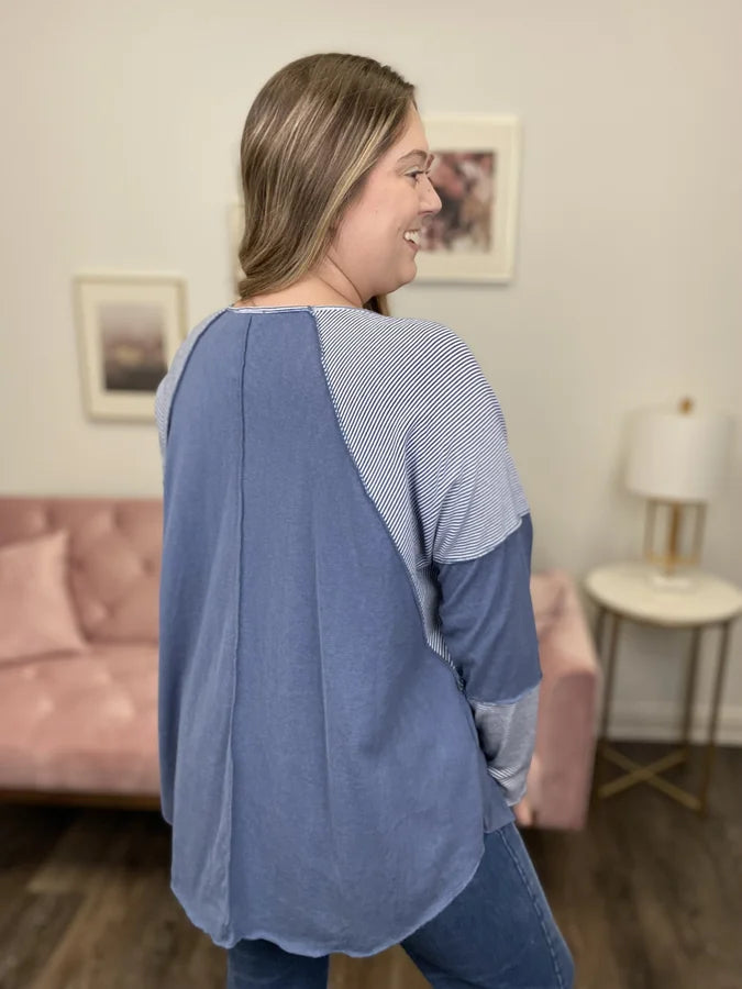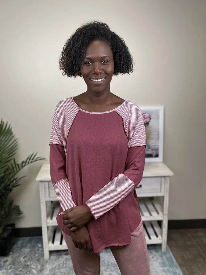 The Starting Memories Top by Easel is a beautiful solid with striped mix top. It features a round neckline, raw cut seam detailing, long sleeves and a rounded raw cut hemline. This top will pair perfectly with your favorite denim for a grab and go look!