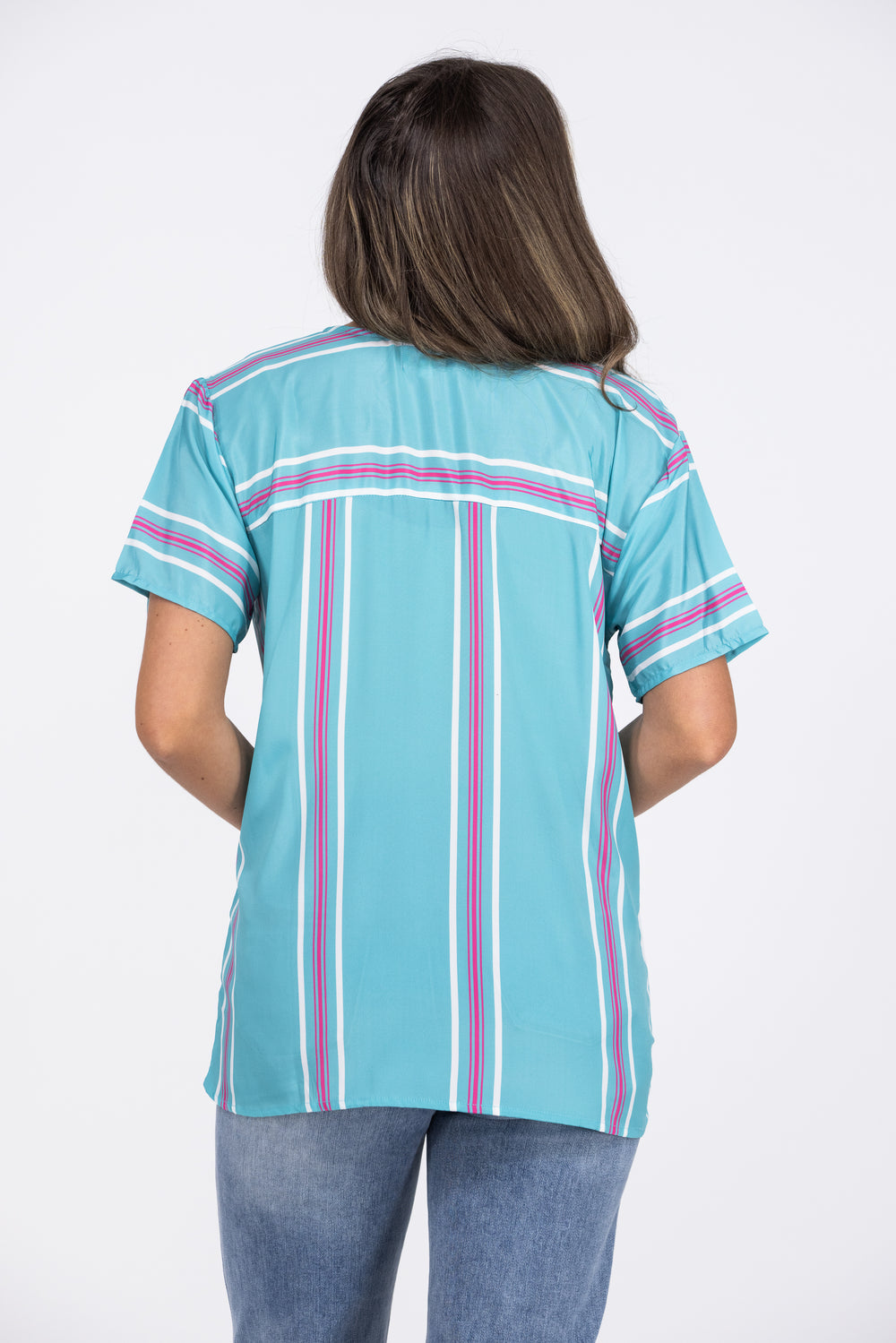 The Sterling Jane Top by Washco is a short sleeve top with a V-neck and a super light, airy feel. Vertical stripes run up the top straight into an embroidered bust line. This top is super soft and perfect for Summer days!