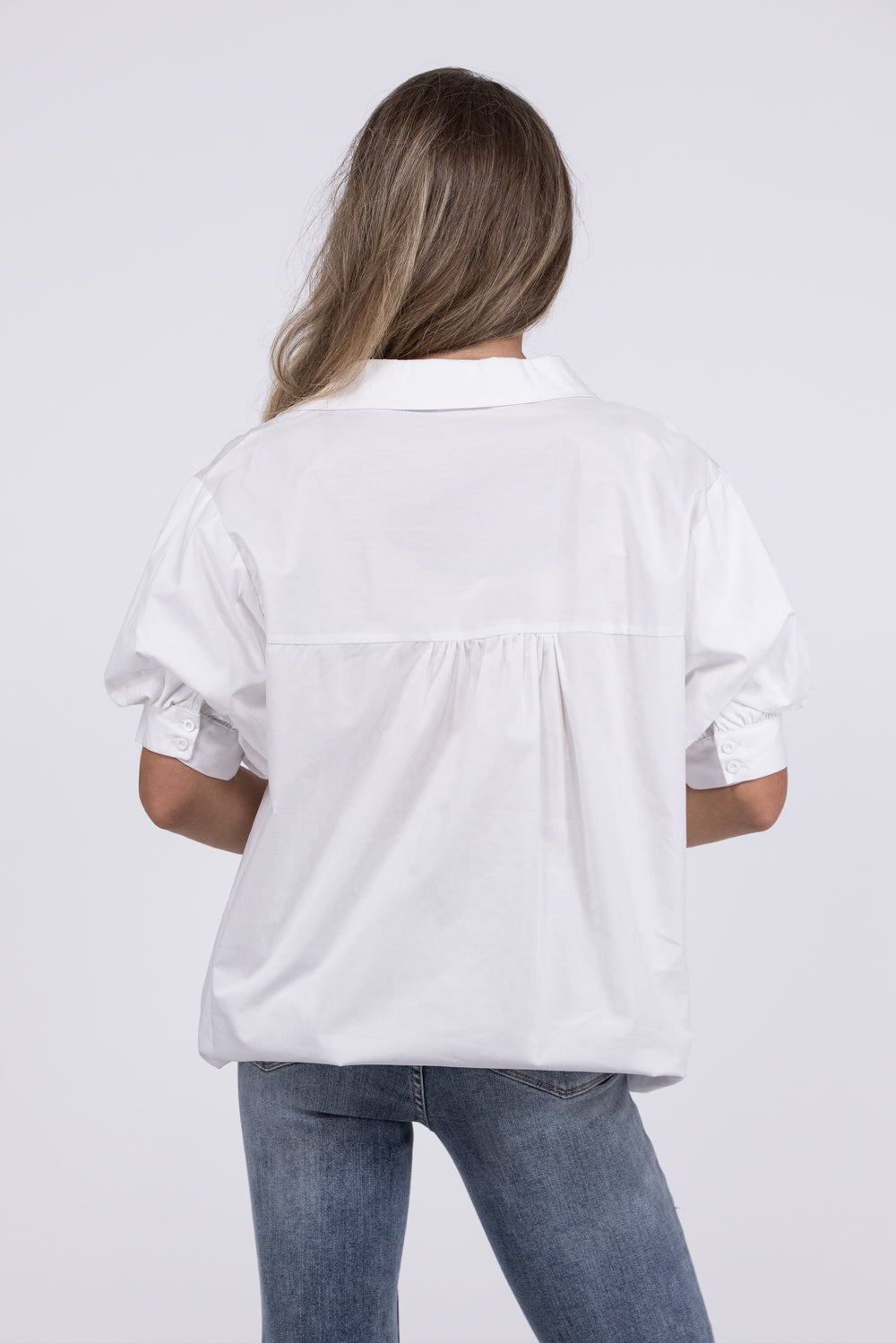 Sticking Around Top by GeeGee is a Woven Collar solid button down blouse, made with an oversized, loose fit. Featuring a hi-lo rounded hemline, and short sleeve cuffed puff sleeves with 2 functioning buttons. Goes great with Leggings and Skinny Jeans.