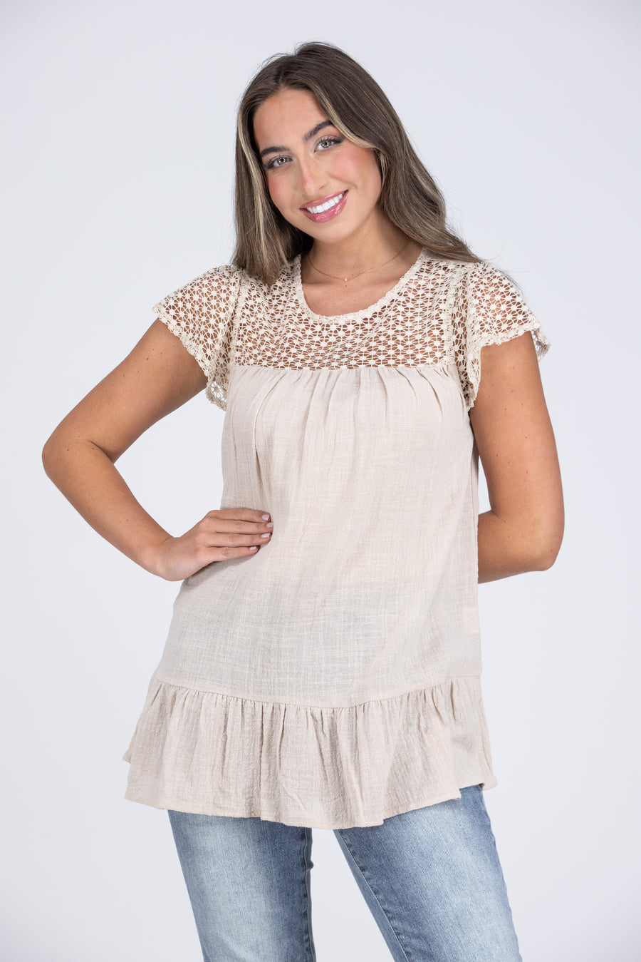 The Strawberry Wine Top By Davi & Dani is a solid longer length top. It features a rounded neckline, ruffle sleeves and hemline and a beautiful crochet like lace pattern on neck. The shirring down the front offers a flattering silhouette.