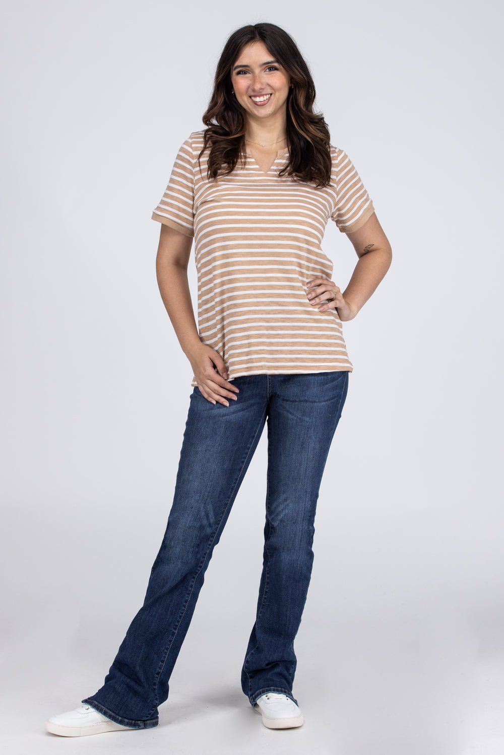 The Stripe-sicle Top by Cotton Bleu is the perfect shirt to wear going golfing or sailing on a boat! This short sleeve top features a round neckline with V-cut, straight hemline with side slits, and fun horizontal stripes! Pair this top with shorts and sneakers for a comfy and casual look!