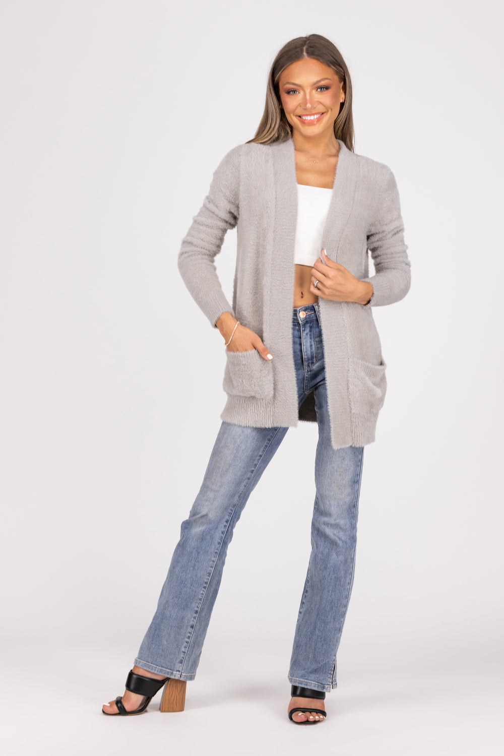 The Stuck On You Cardigan by Be Cool is a simple yet elegant fuzzy cardigan, featuring 2 ribbed front pockets, ribbed cuffs, and a ribbed hemline. This open front cardigan is amazingly soft. Goes great with denim, leggings, and khaki.