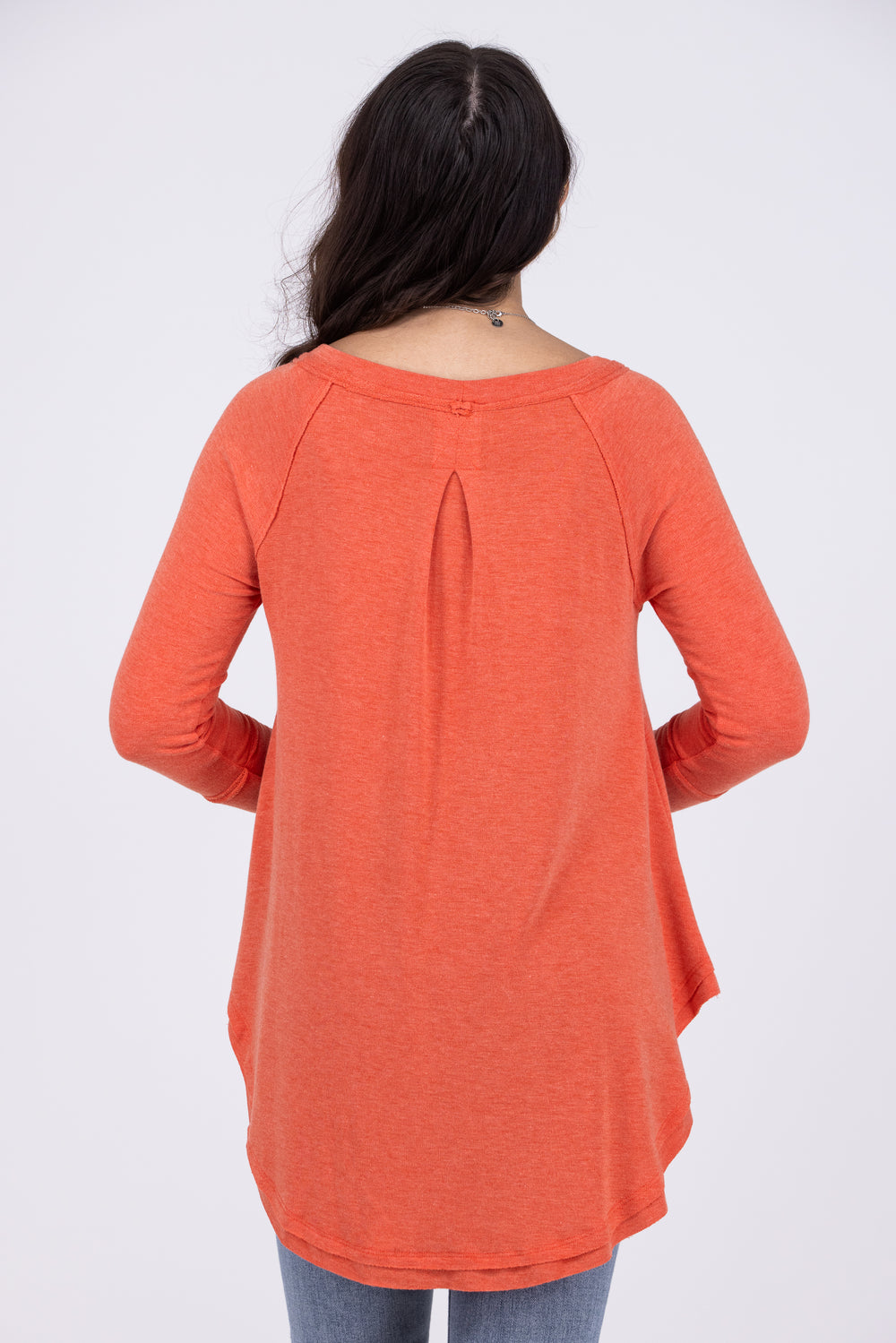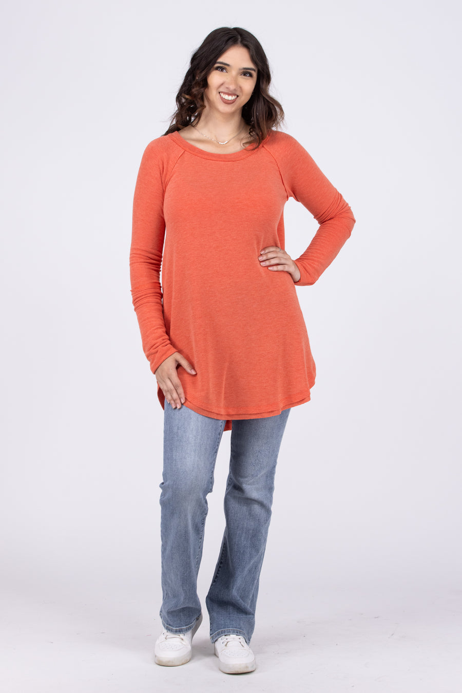 The Weekend Comforts Top by Bucket List is a boat neck solid top, with long raglan sleeves, a curved hem, and raw edge details. The back is box pleated, and contributes to the overwhelming relaxed fit, not to mention look.