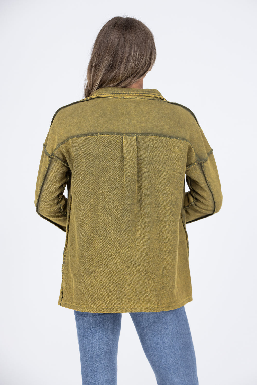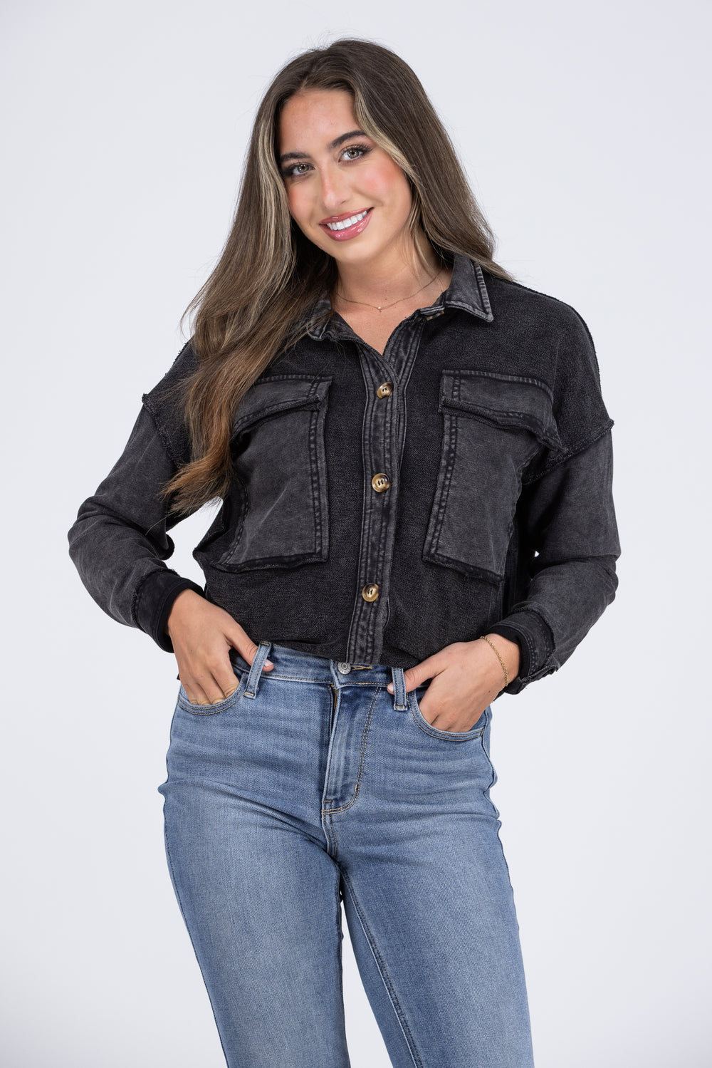 Step out of the house looking like a stunner in The Super Stunner Shacket from Heyson! It is sculpted from a washed french terry into a classic silhouette, showcasing a button- front bodice, collar, 2 front pockets, reverse fabric detail, dropped shoulders, and long sleeves. The straight hemline and slight pleating at the back elevate the look. The unique color of the pigment vintage wash is achieved through a special dye and washing process. Results vary from one another, creating a unique and natural variance in texture, distress, and shade. Yours is truly one-of-a-kind. These are intentional and not defective. Pair with our "Escape From Reality 2-Way Neckline Tank Top", our "Lovervet Always Genuine High-Rise Tummy Control Crop Skinny Denim", and our "Fall Booties" for an adorable look.