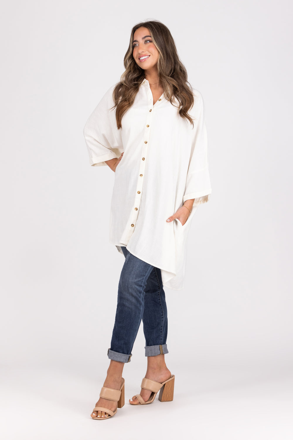The Sway In The Breeze Top by Ces Femme can be worn open or closed depending on your outfit that day! This short sleeved top features a collared neckline, cuffed sleeve edges, hidden pockets, and an oversize fit. Throw on your favorite cami and tie this shirt up for a cute look!