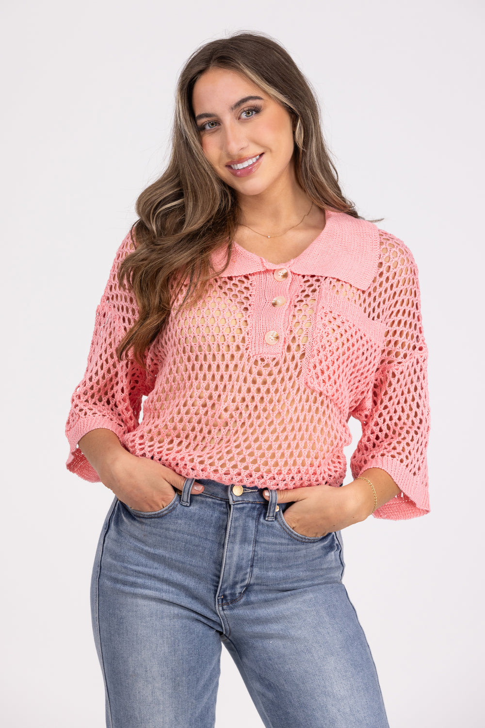 Stay cool out on the golf course in the Sweet Breeze Short Sleeve Sweater by BIBI as you breeze over the greens. Features a collared neck with functional buttons, short sleeves with ribbed cuffs, drop shoulders, a straight ribbed hemline, and a front pocket. Pair this light and airy top casually with jeans or dress it up with slacks or dress shorts.