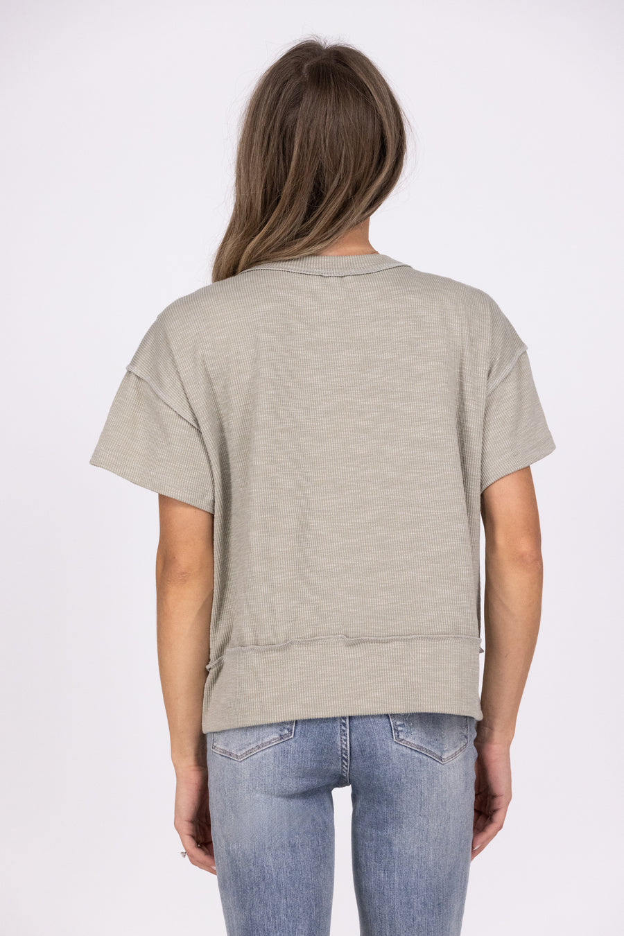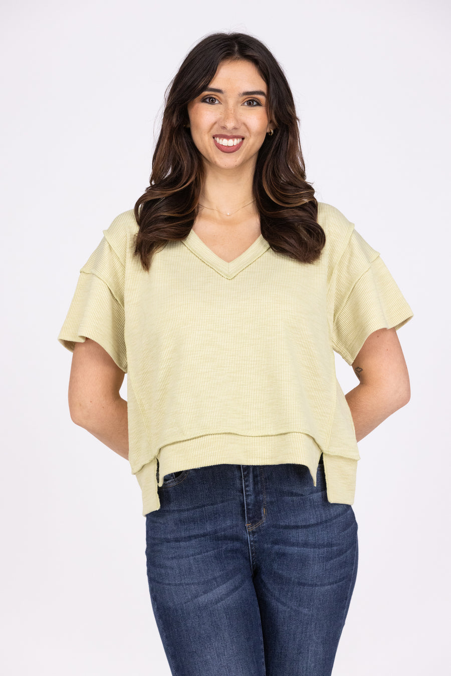 The Sweet Nothings Lounge Top by Easel is a solid textured ribbed knit top. It features short sleeves, V neckline, slightly cropped length, side slits and outer seam detailing! Make sure you pair with are "Sweet Nothings Lounge Shorts"