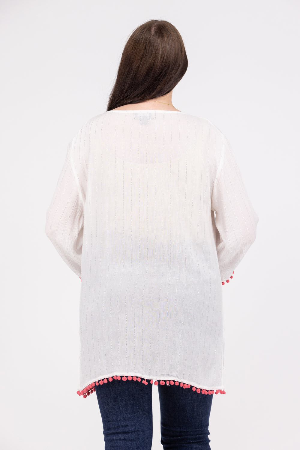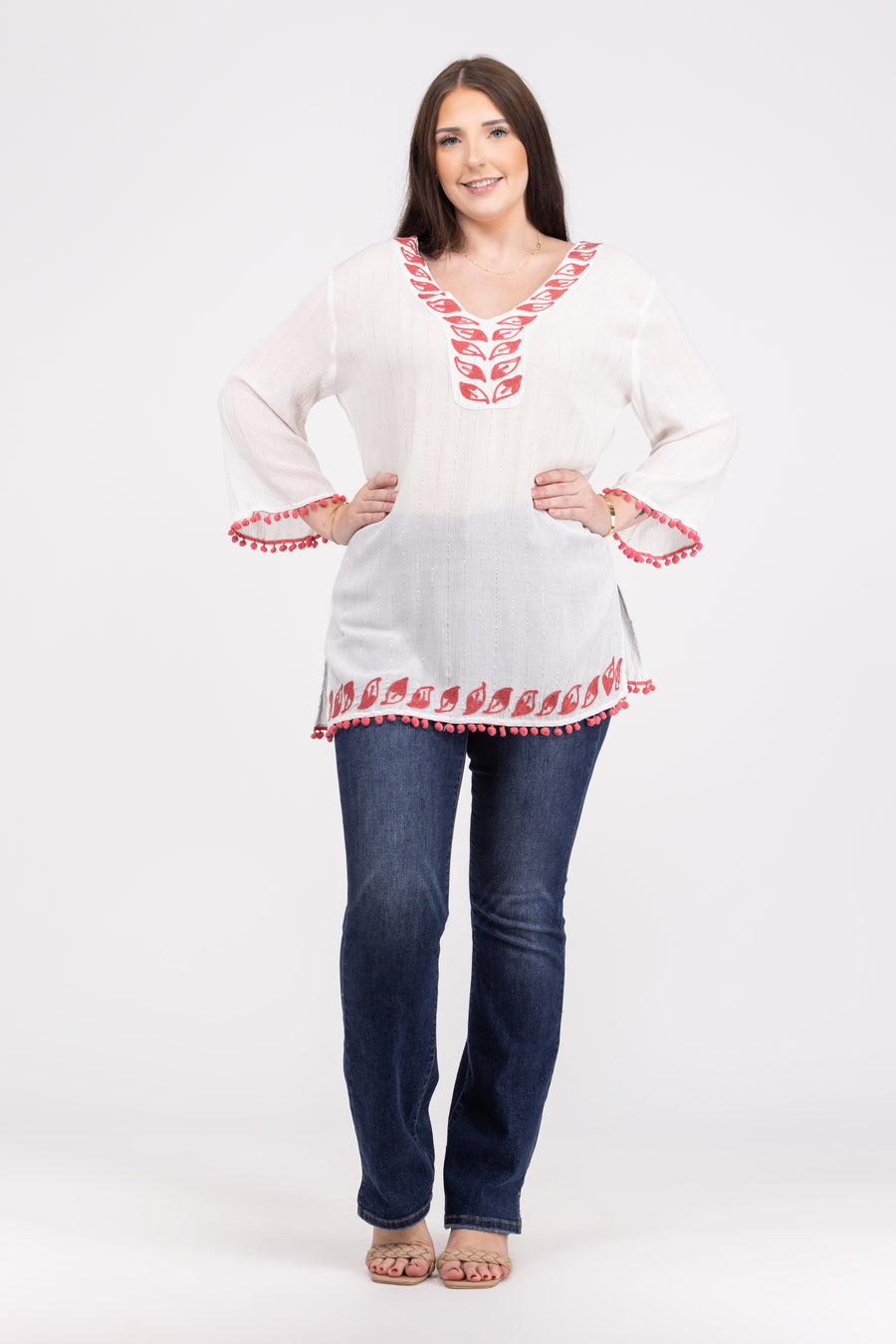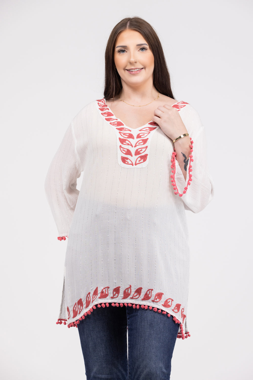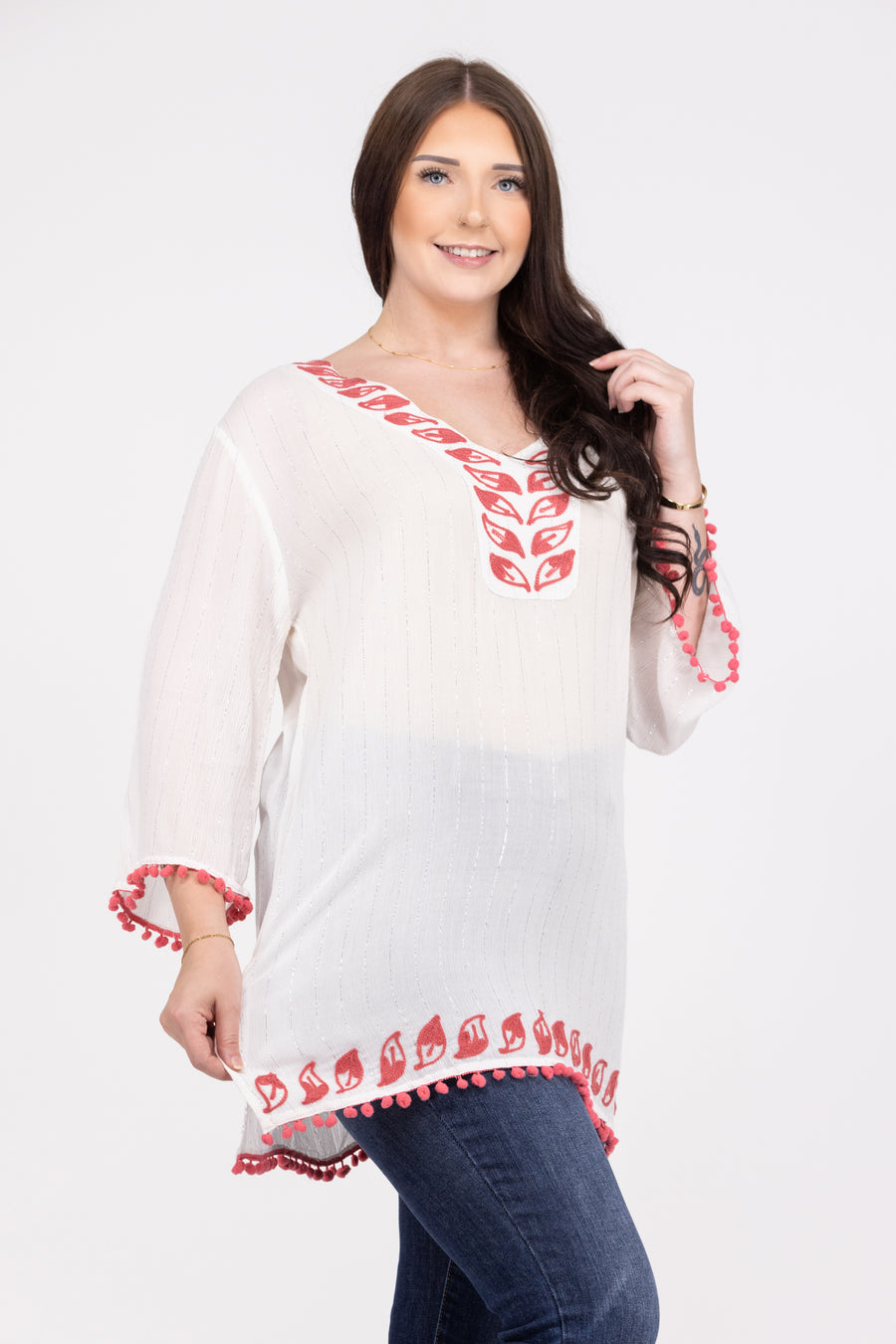 The Take a Chance Top by Fashion Fuse is a tunic style top handcrafted in India. Featuring 3/4' sleeves and a straight hemline, both are trimmed with Pom-Pom fringe. The V-neckline features leaf like embroidery and metallic pinstripes that run the length of the top. Flattering side slits put the finishing touches on this masterpiece.