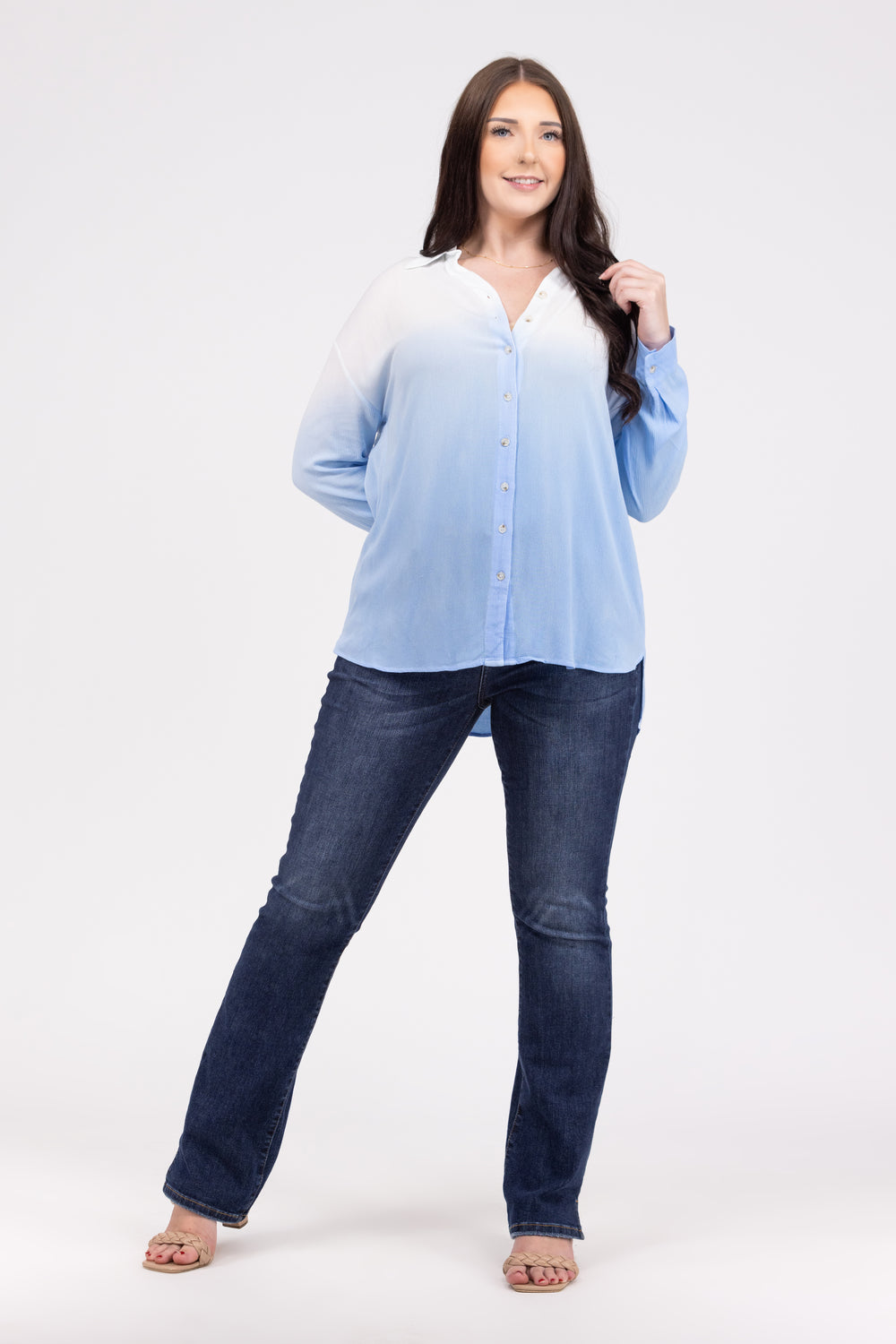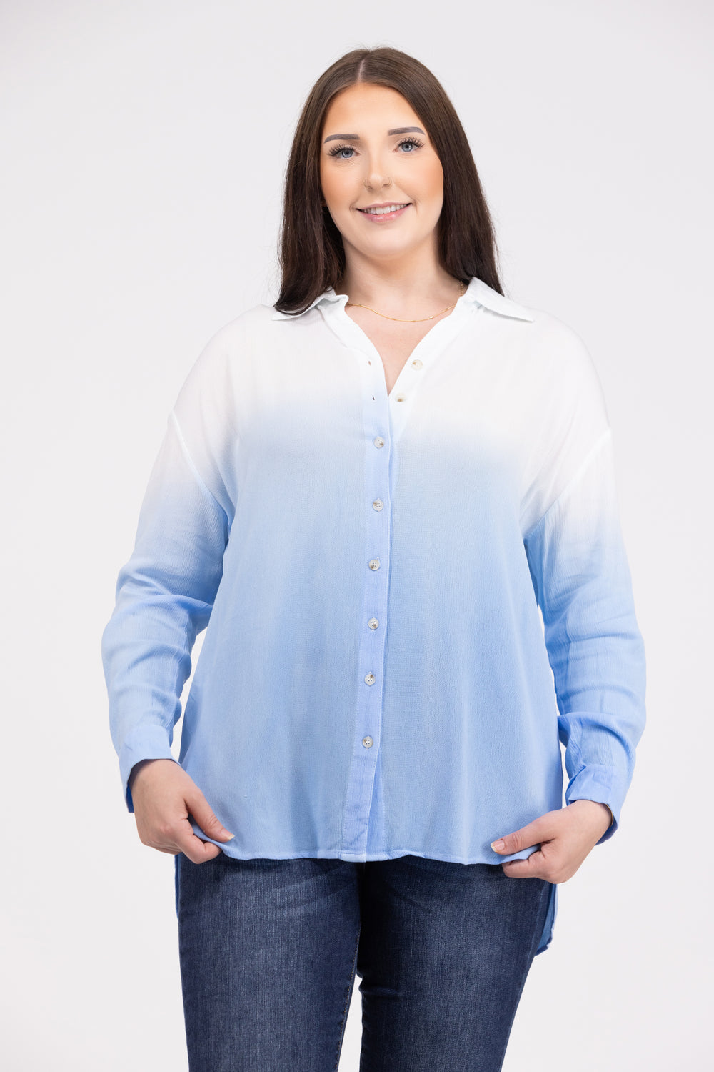 The Take A Dip In The Ocean Top from Davi & Dani is a ombre dip dyed top. It features a collared neckline, button front and long sleeves with button to cuff. This will pair perfectly with a white denim! Wear it unbuttoned with a tank or cropped tank underneath or buttoned for a classic look!