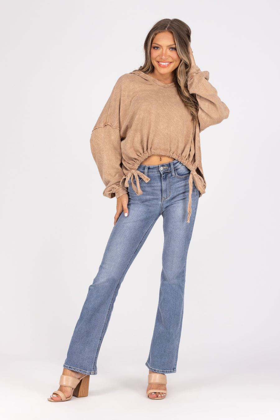 The Take On The Day Sweater by J. Her is the perfect sweater to make any day great. This sweater features a hood, V neckline, exposed seams, a high low look, and a cinch at the front with two knots. This sweater pairs great with some denim jeans or some comfy pants.