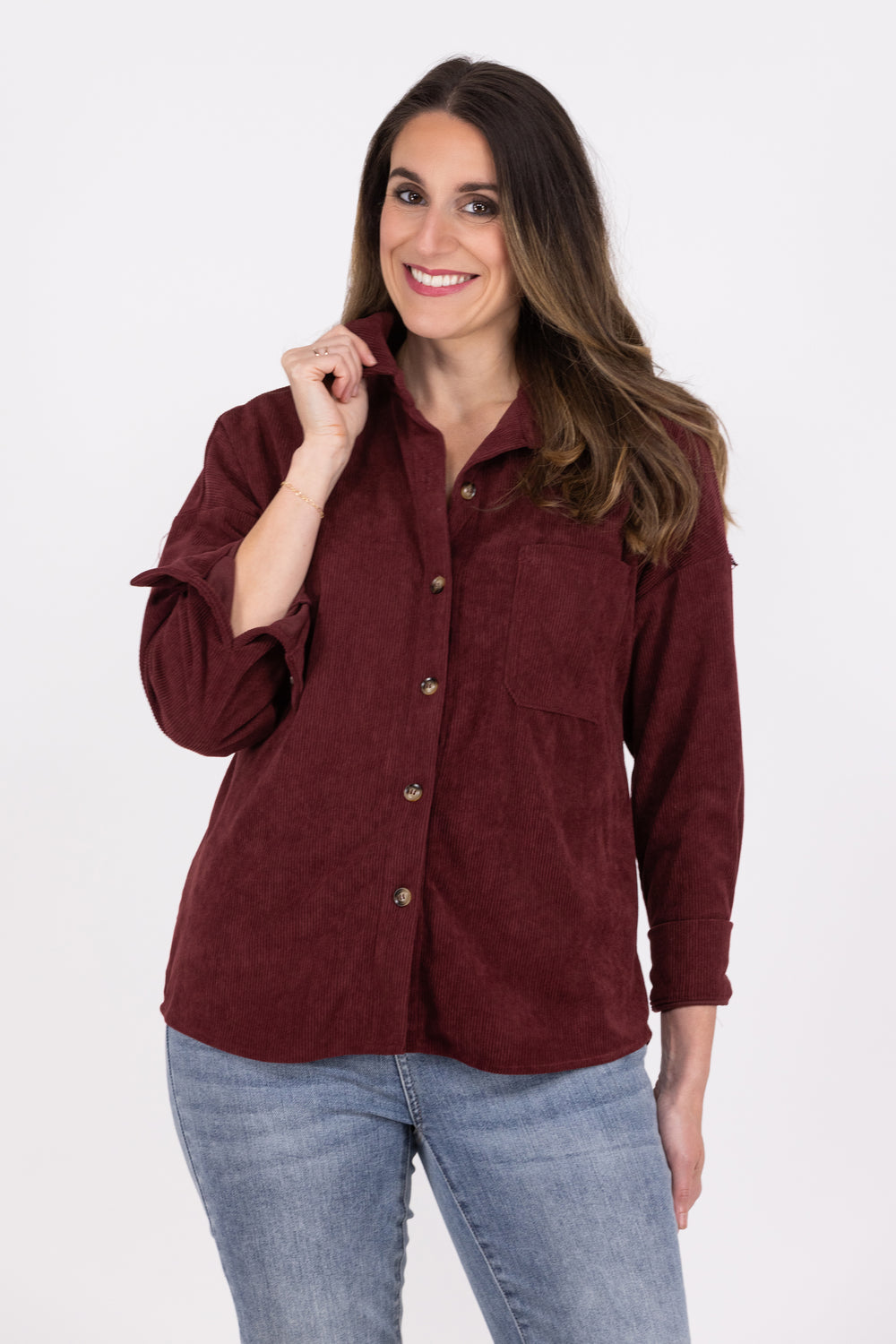 Why do button downs have to be boring?! The Tangle Of Cords Top from Andree by Unit brings a unique fabric to your favorite button down style! It features a collared neckline, full button down, long sleeves with cuff, chest pocket, and a round hemline. The corduroy adds wonderful texture that you will love!