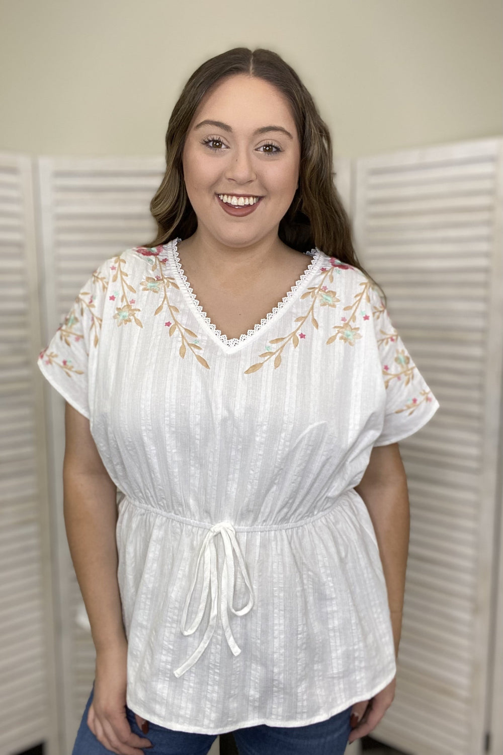 The Tell Me About Your Dreams Top From Andree By Unit is a cute cotton blouse. It features a peplum bodice with v neckline and short dolman sleeves. We love the neutral colorway for this Savanna Jane embroidery design. Non sheer, woven.