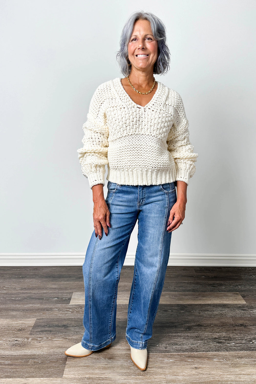 - Front Seam Detail: A vertical seam that runs down the front of each leg, helping elongate the profile and adding a tailored touch to the otherwise loose silhouette.