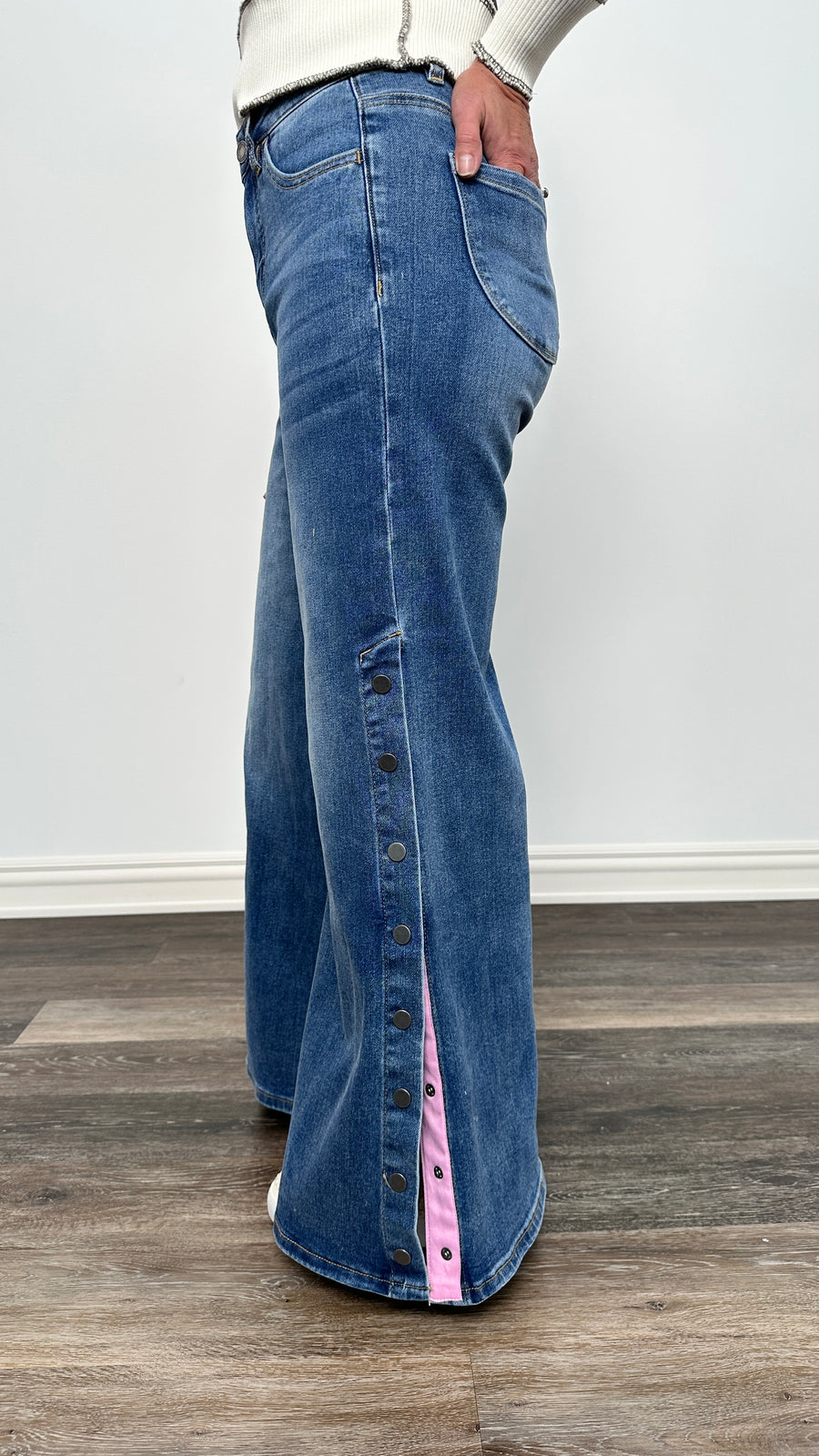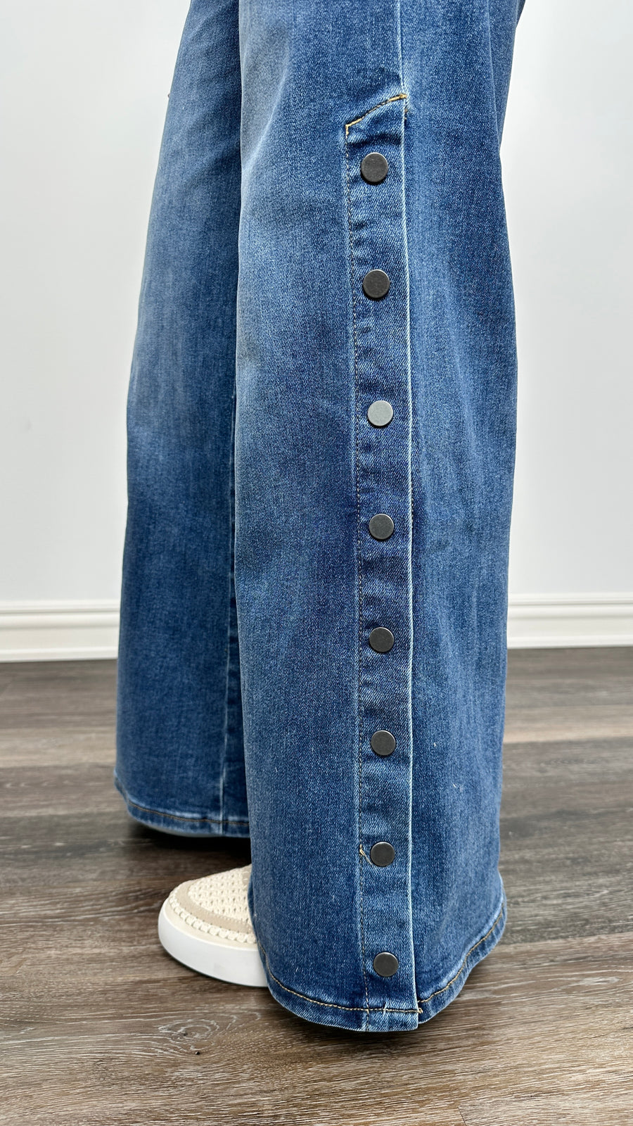 A polished take on statement denim designed to flatter from every angle. High-rise wide leg denim with a relaxed fit through the hips and thighs and built-in tummy control. Snap details running down both legs, starting just above the knee, add a bold yet tailored edge.