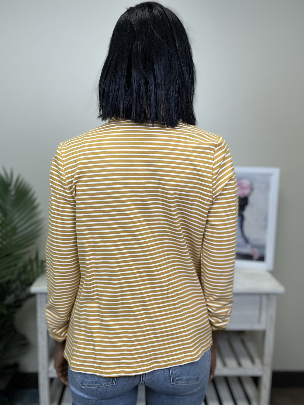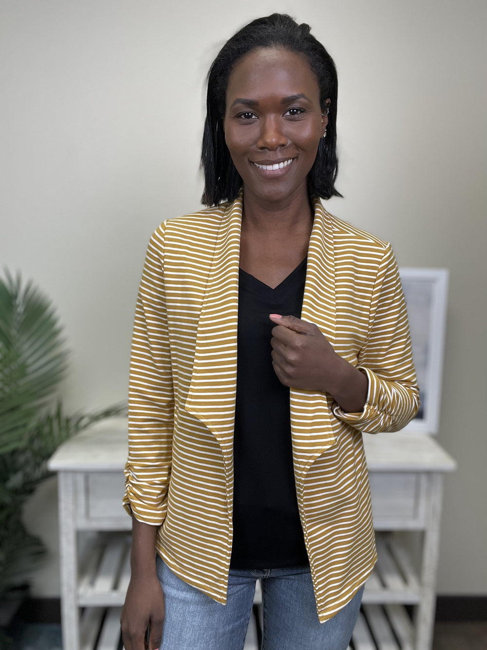 The Best Blazer by Doe & Rae is the perfect compliment to so many pieces in your wardrobe! The mustard and white striped open blazer features sleeve elastic and shirring detail. You'll always feel the best when you're wearing this blazer!