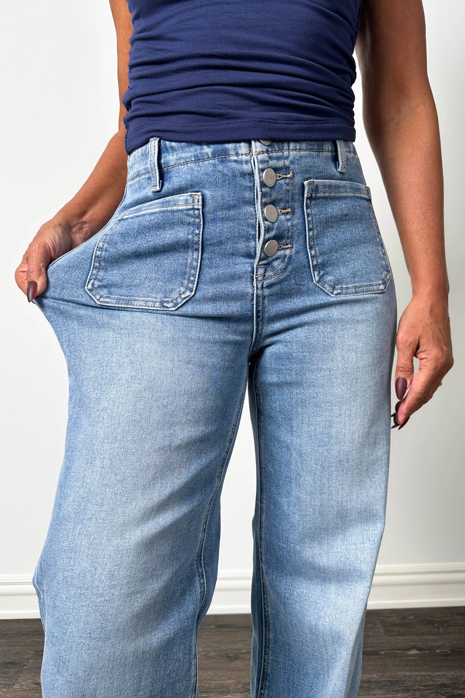 - Medium Wash: Non-distressed with whiskering.