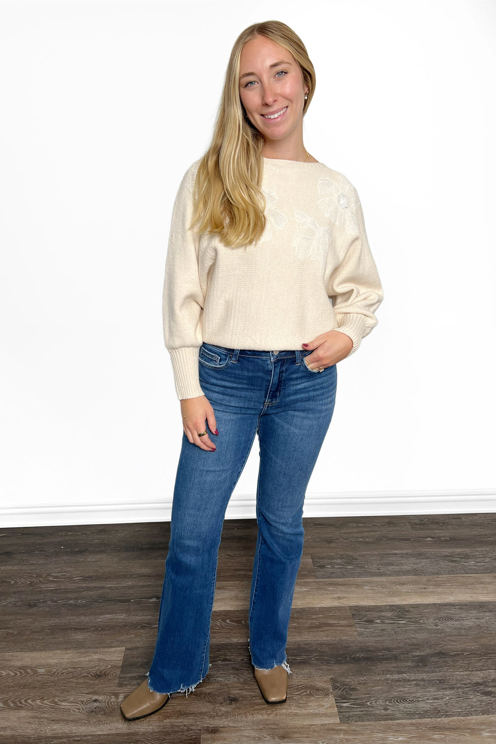 Hem: Raw hem detail adds a modern, effortless touch to the clean bootcut silhouette.