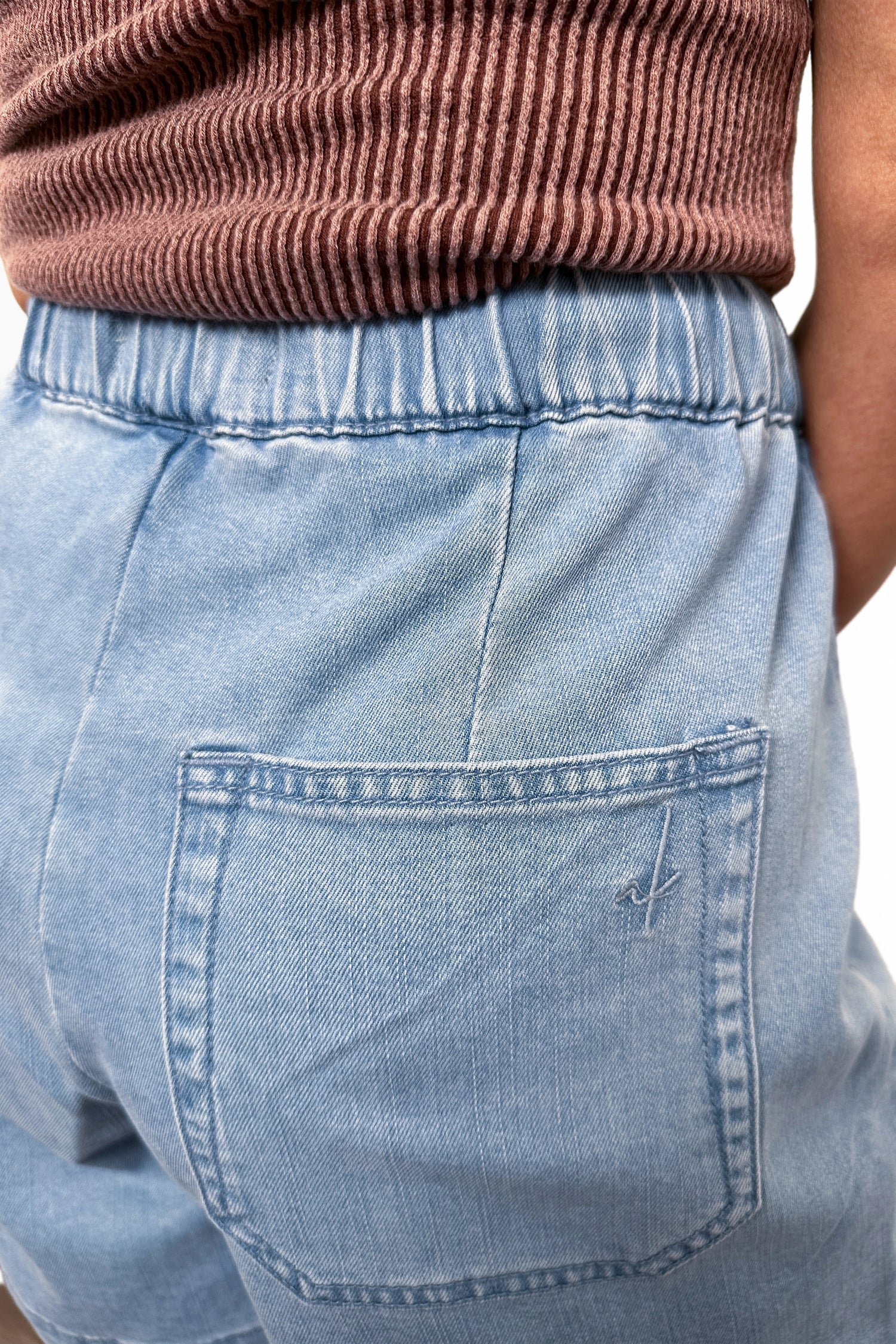 These are high-rise pull-on denim shorts with a relaxed fit, elastic drawstring waistband, and soft lightweight denim blend. The easy pull-on design keeps them comfortable, while the light wash and clean finish make them feel intentional instead of overly casual.