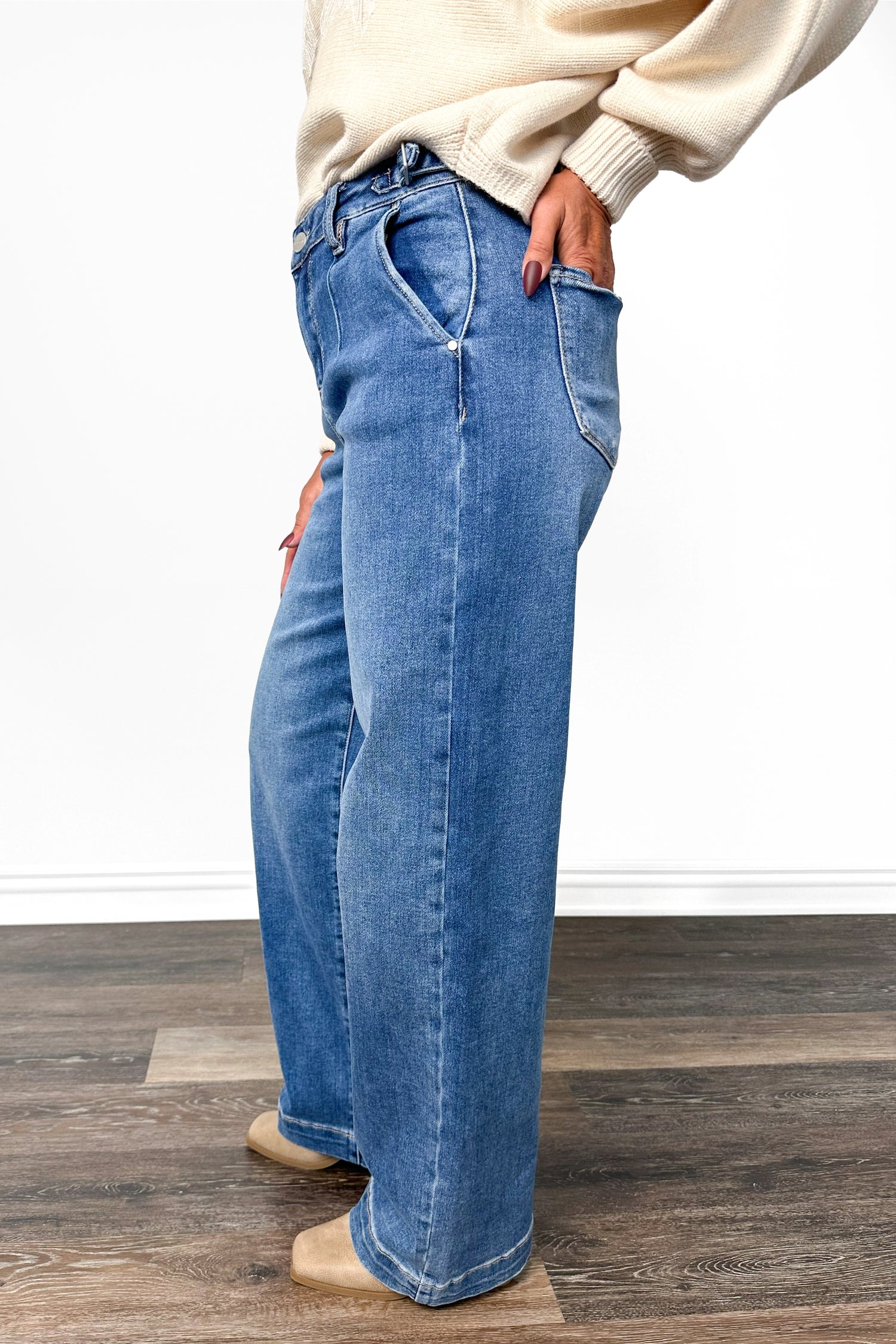 Slouchy Wide Leg: Full through the hips and thighs, with a generous wide-leg that flows down.
