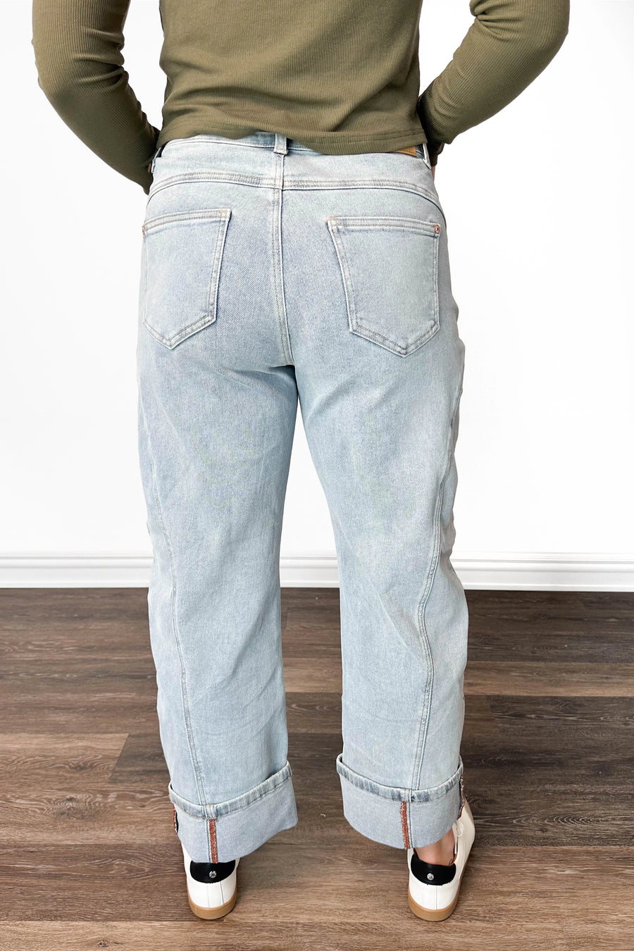 The Krystal from Saige: High-Rise Barrel Leg Wide Cuff Denim