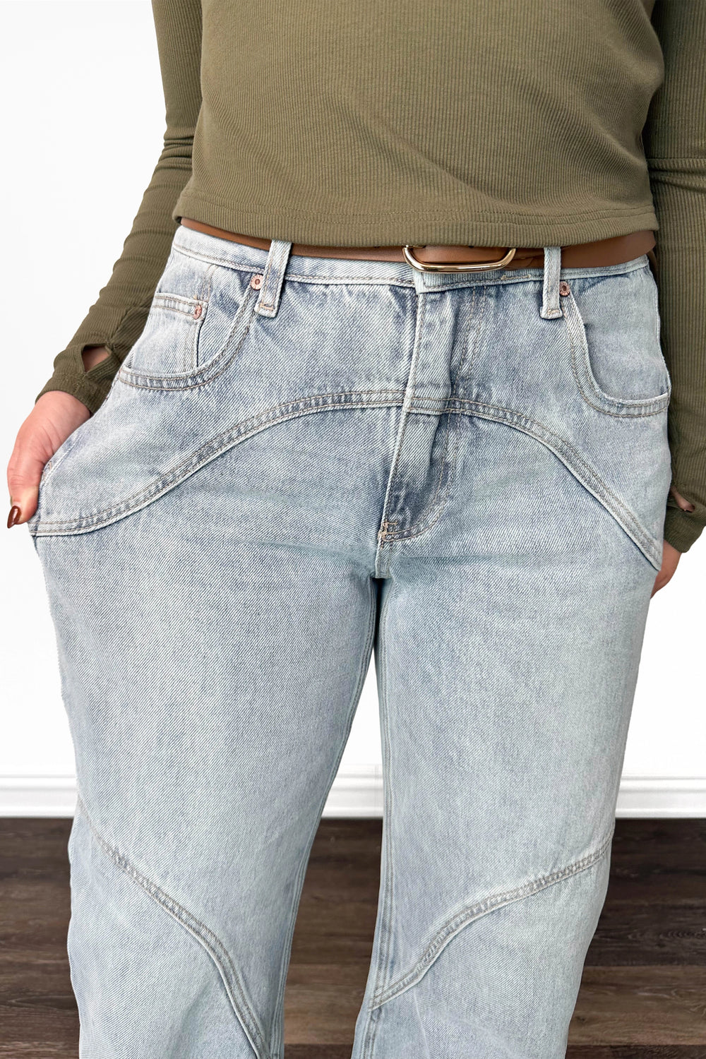 • Wide Barrel Leg: A relaxed fit through the thigh with the legs curving outward at the thigh/knee and taper slightly at the ankle, creating a rounded "barrel" silhouette.