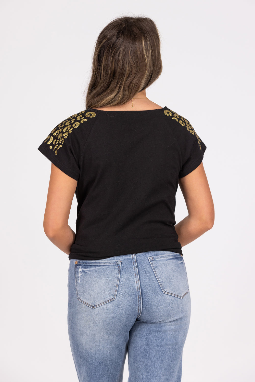 The Lizzy Top By Wash Co Apparel is a classy basic top you will love! This cap sleeve top features a V-neckline, straight hemline and gold animal print embroidery sleeve detail. This top is the super cute top you need!