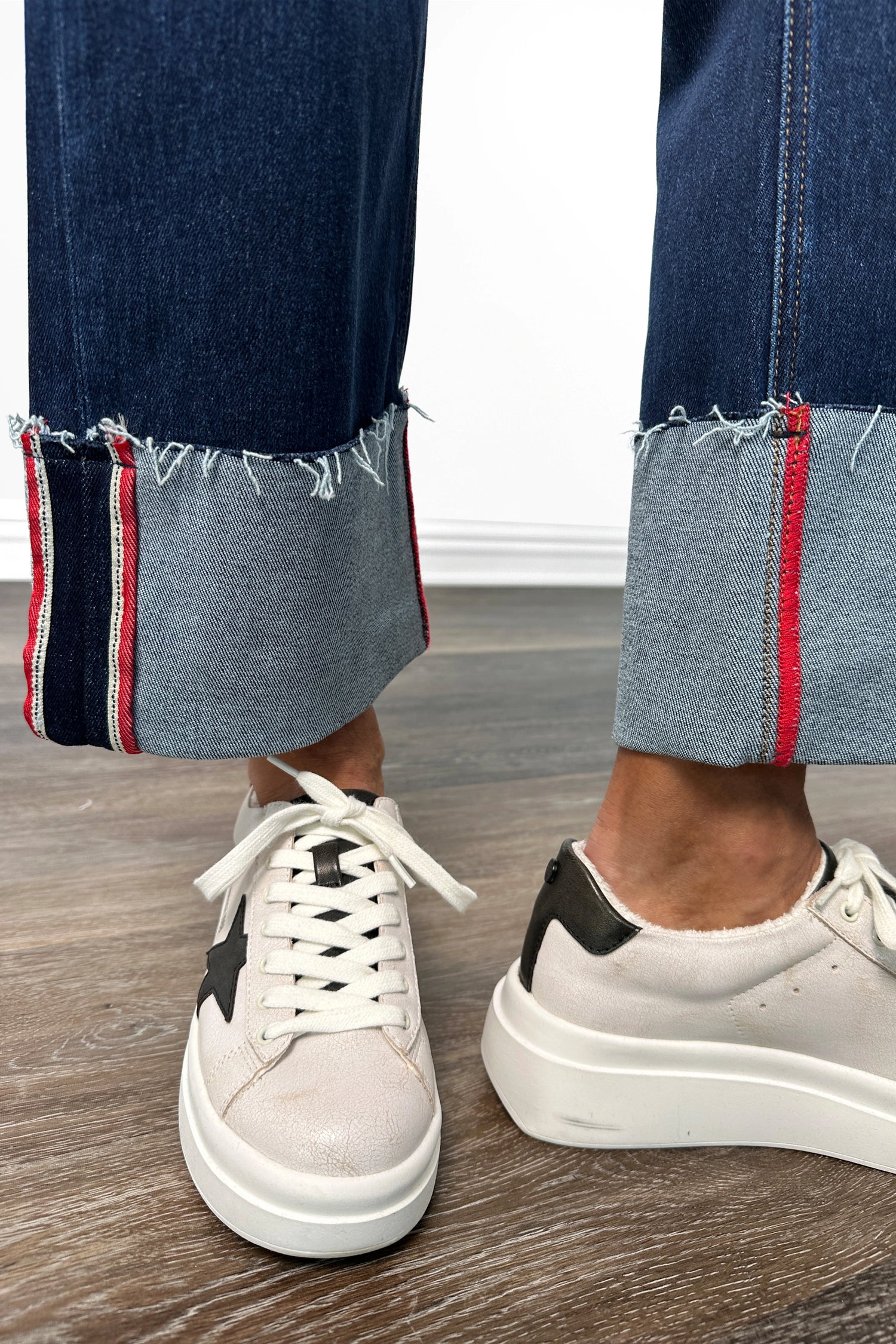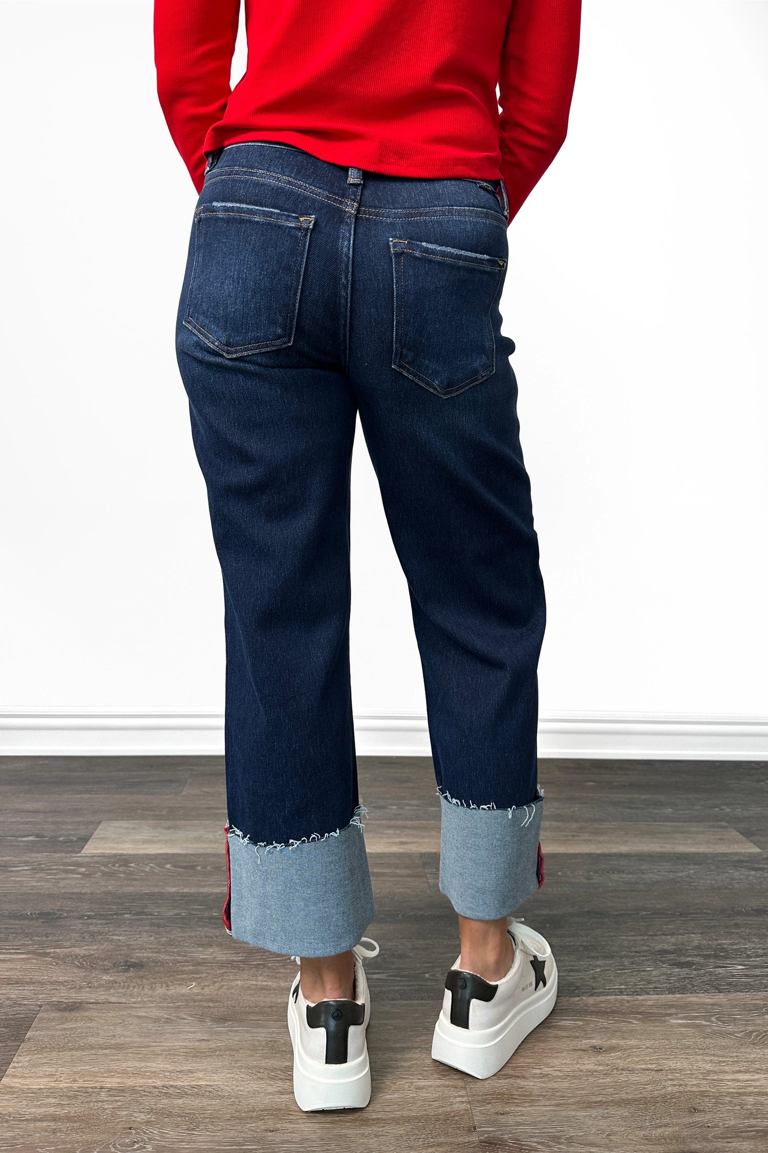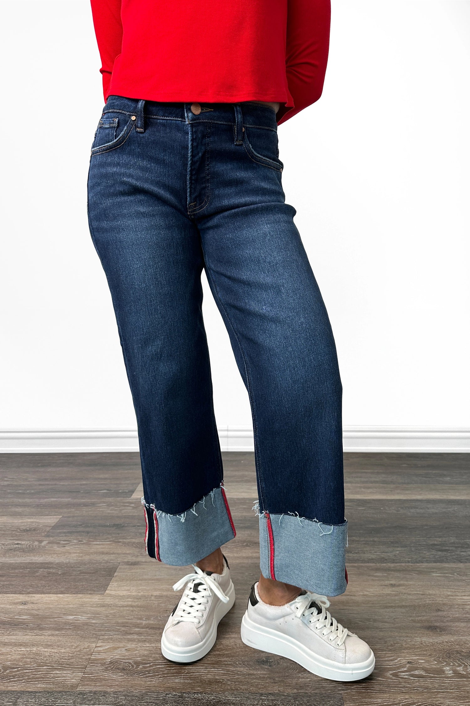 Cropped Wide Cuffed Leg: Wide through the thigh giving a relaxed yet structured shape, perfect for pairing with sneakers, sandals, or ankle booties.