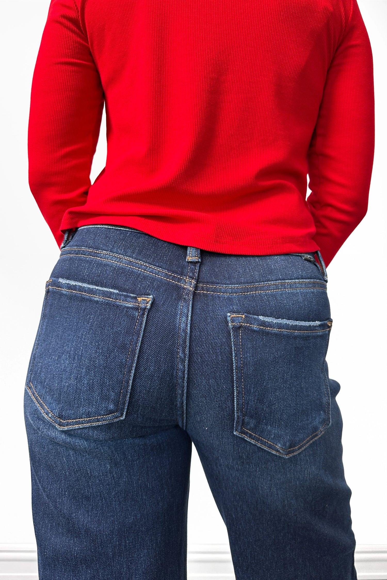 - Mid-Rise: Sits just below the natural waist providing a comfortable fit that's not too low or too high.