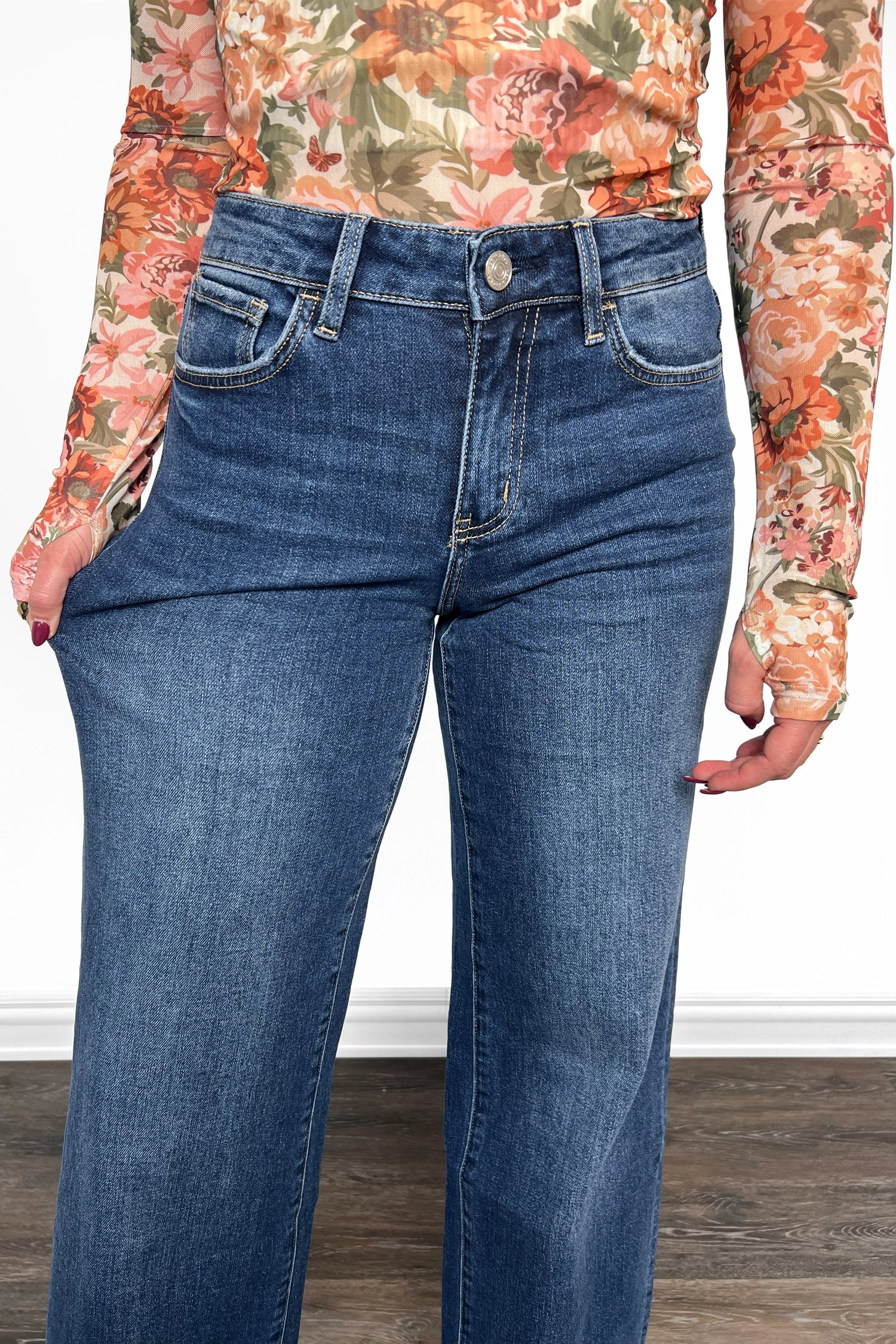 - Dark Wash: with subtle whisker fading near the front pockets/upper thigh for dimension.