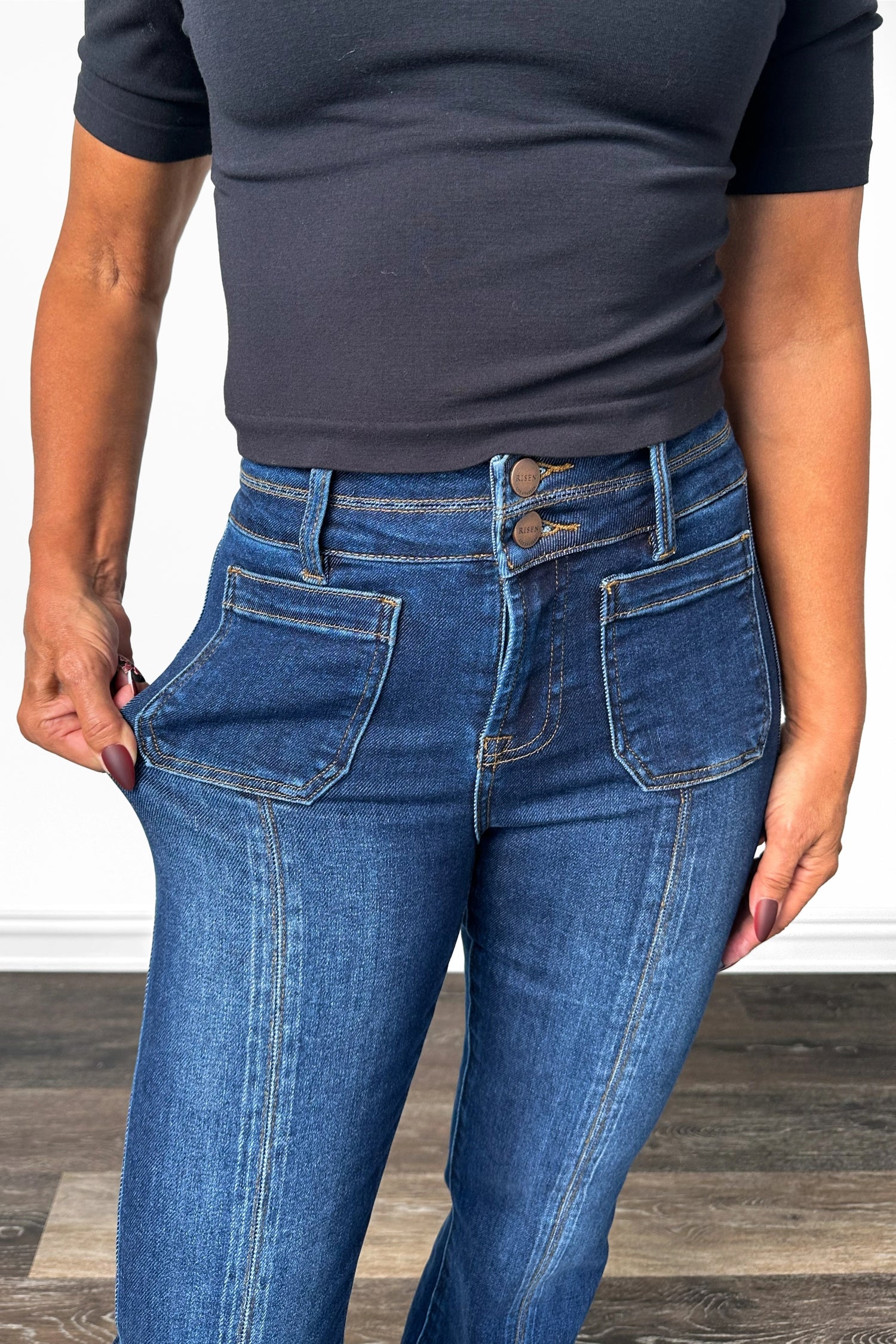 The Paige from Risen: High-Rise Double Waist Band Ankle Bootcut Denim